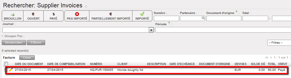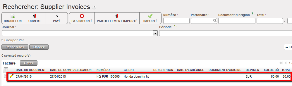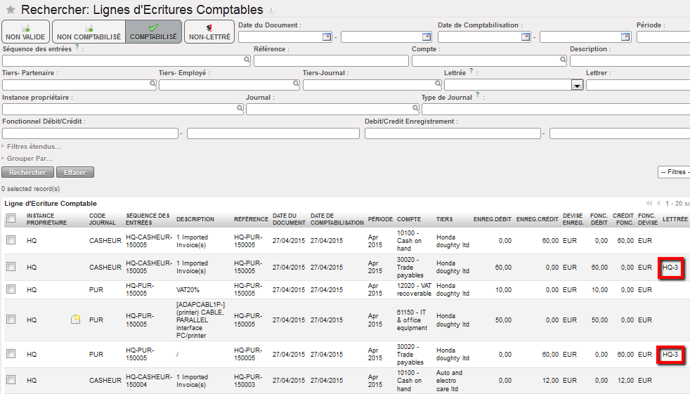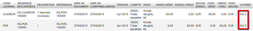 L’allocation est effectuée; l’écriture apparaît maintenant en noir. La ligne d’écriture est en mode brouillon.