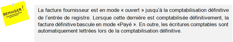 Écritures comptables correspondantes , compte fournisseur lettré une fois que l’entrée est comptabilisée définitivement dans le registre