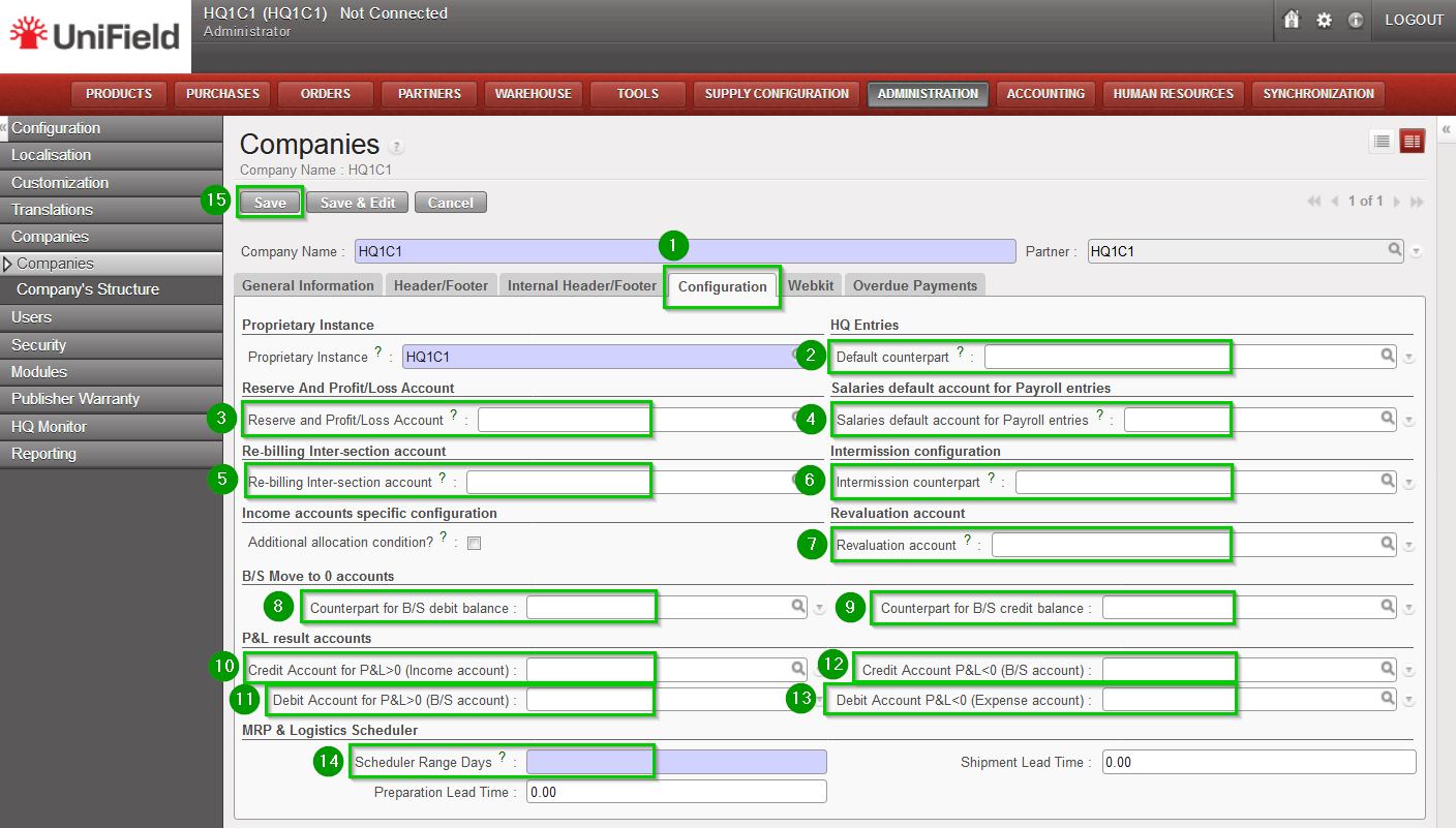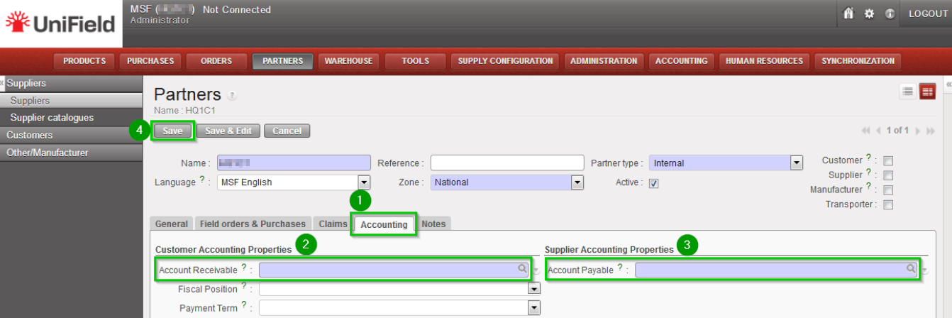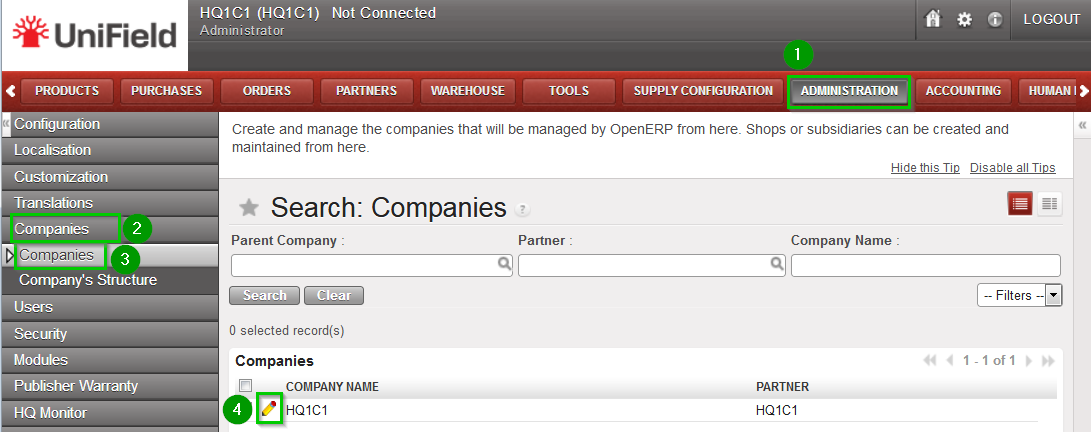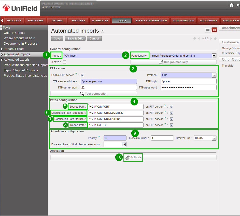 | Fill the following fields Name 1: provide a name to the import job Functionality 2: choose one. All import features are listed here, but so far Vertical Integration is supposed to rely on Import Purchase Order and Confirm or on Import Incoming Shipment only.If you want to retrieve the files from an FTP server, check the box and type your FTP host and credentials on the FTP server section 3 Set the paths under the Paths configuration section 4: