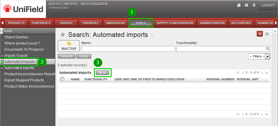 | Configuration: Log in your instance and click on menu TOOLS 1,Automated Imports 2 Click on New 3 to create a new scheduled import | ![]() |