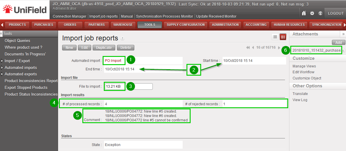 | Monitoring: You can see the history of imports by clicking on menu TOOLS 1, Automated imports 2, Import job reports 3 You’ll get a list of all past executions. You can filter the list by status, import function, date and time or Import File name. Click on any line 4 to get more information | ![]() |