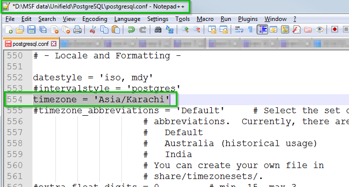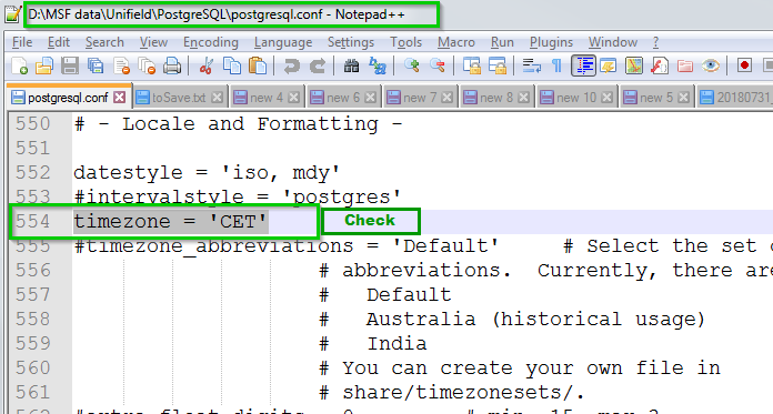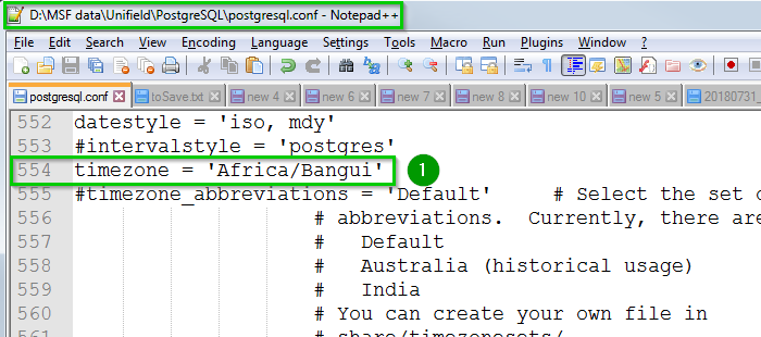 Check first the current time zone information set by Postgres: File path: D:\MSF data\Unifield\PostgreSQL File name: postgresql.conf line: timezone = 'CET' In our example it is set to: CET