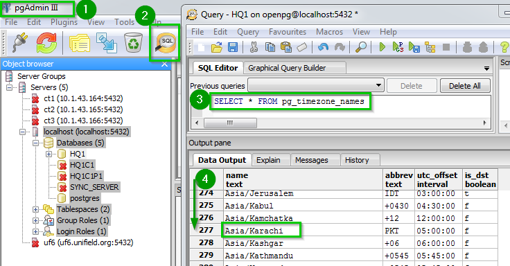 Open pgAdmin 1 Open a SQL query window 2 to check the list of availalbe Postgres time zone Run the following sql query 3SELECT * FROM pg_timezone_names; Scroll down 4 the list to find Karachi Copy this information to your clipboard.