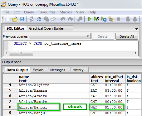As above look at the pgAdmin time zone list that would suit the (UTC+01:00) West Central Africa In our case timezone would be 'Africa/Bangui' which is UTC+01:00 -without daylight savings- just like Micosoft’s West Central Africa time is.