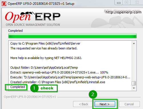 When it finishes you will see at the bottom of the text area a Completed notification 1 meaning the installation is now done. Click Next 2