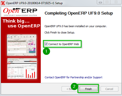 Leave the Connect to OpenERP Web box checked 1. Click on Finish 2