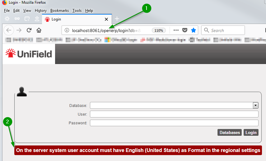 The default browser starts running and connects locally to UniField 1 A warning message 2 is displayed on the homepage to ensure that your regional settings are set to “English (United States)”. If it is already done, you can omit it and proceed.