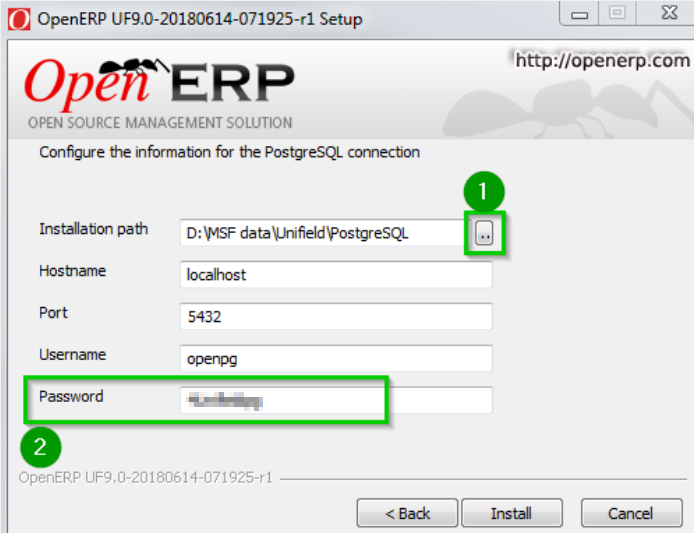 Click on “…” 1 if the standard path does not suit you. Leave all the fields as shown except for the Password. For security reasons, you should not leave this default value; change Password 2 to something that will be remembered. This value will never be changed. Click Install