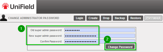 Enter the old password 1. If it’s a first installation, you must enter the default super admin password. Enter the New super admin password and confirm it. Click on Change Password 2