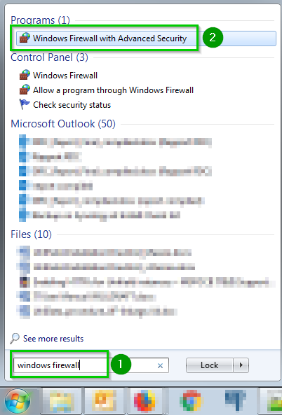 Click on the Windows Start menu at the bottom left. In the Search programs and files field, enter firewall 1 without pressing enter. Click on Windows Firewall with Advanced Security 2
