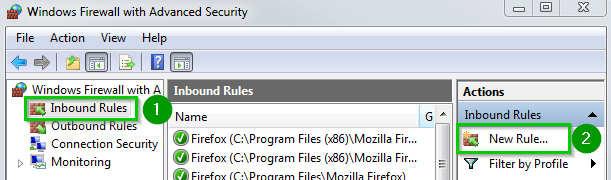 Click on Inbound Rules 1. The inbound rules will now be listed. Click on New Rule… 2 A new wizard will open