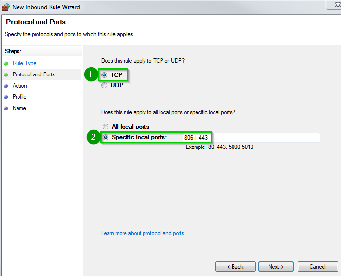 Select TCP 1 Specific local port 2: enter 8061. If you will be using a different port (i.e. 80) set that instead. If you will be enabling HTTPS (section 1.9) add port 443 (separated with a comma). Click Next.