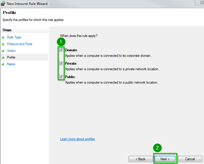 Select the appropriate options 1 regarding your network configuration. By default select Domain, Private and Public. Click Next 2