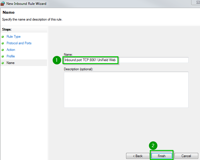 Enter a name 1 such as Inbound port TCP:8061 UniField Web Click on Finish 2