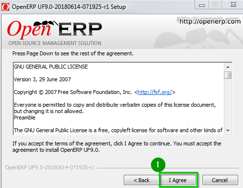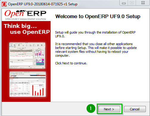 Use Windows Explorer to browse to the directory where the UniField installer is located. Double click on the installer e.g: openerp-allinone-setup-UF10.0-20180914-083009-r1.exe In case the window User Account Control appears, allow the program from an unknown publisher to make changes. Click Yes. The following window appears: Click on OK 1