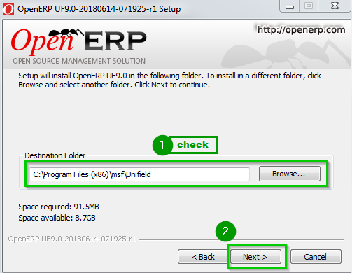 Click on Browse 1 if the standard path does not suit you. Otherwise, Click Next 2