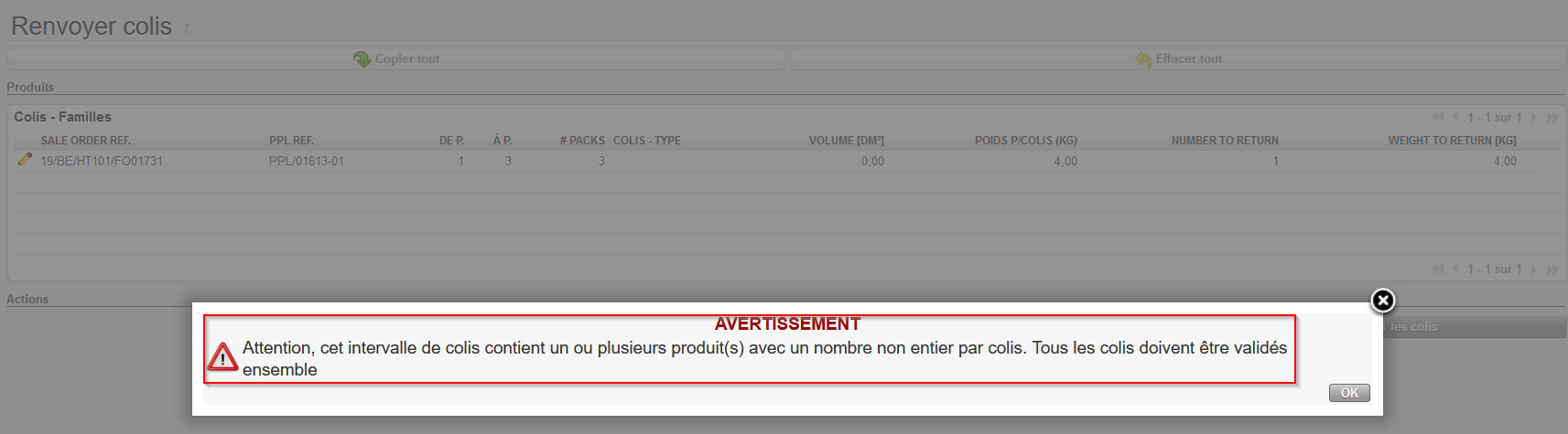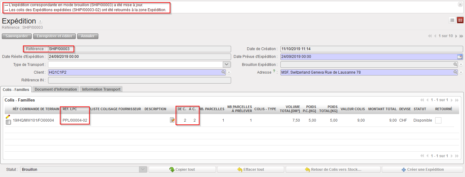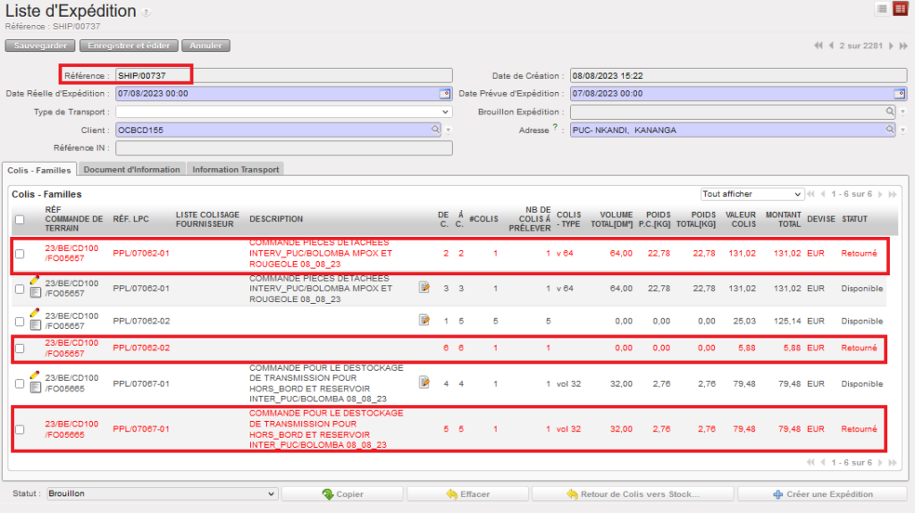 Si le OUT est seulement partiellement traité (comme c’est le cas dans l’exemple ci-dessus), un back-order est créé. Les produits/quantités traités sont enregistrés sur un nouveau OUT dont le statut est “Expédié“, tandis que le OUT initial reste ouvert (au statut “Confirmé“) afin de pouvoir traiter les produits et quantités qui seront reçus en cross-docking dans le futur.