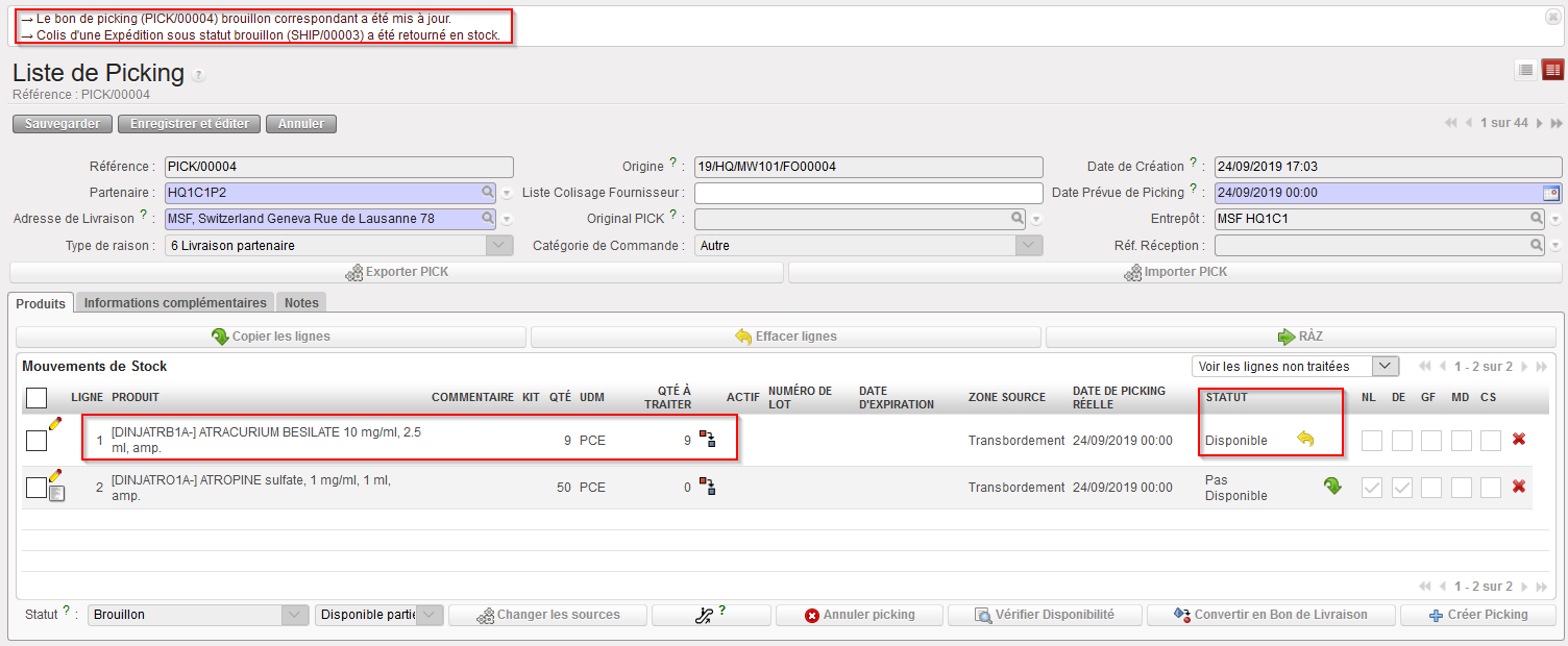 Si le OUT est créé suite à la conversion d’un PICK “Disponible“, il est créé au statut “Disponible“.