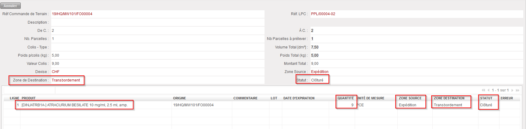 La zone source est “Transbordement“. Les quantités déjà réceptionnées en transbordement sont “Disponible“, tandis que les quantités non réceptionnées sont “Pas Disponible“. Notez le message apparaissant en jaune dans l’écran ci-dessus.