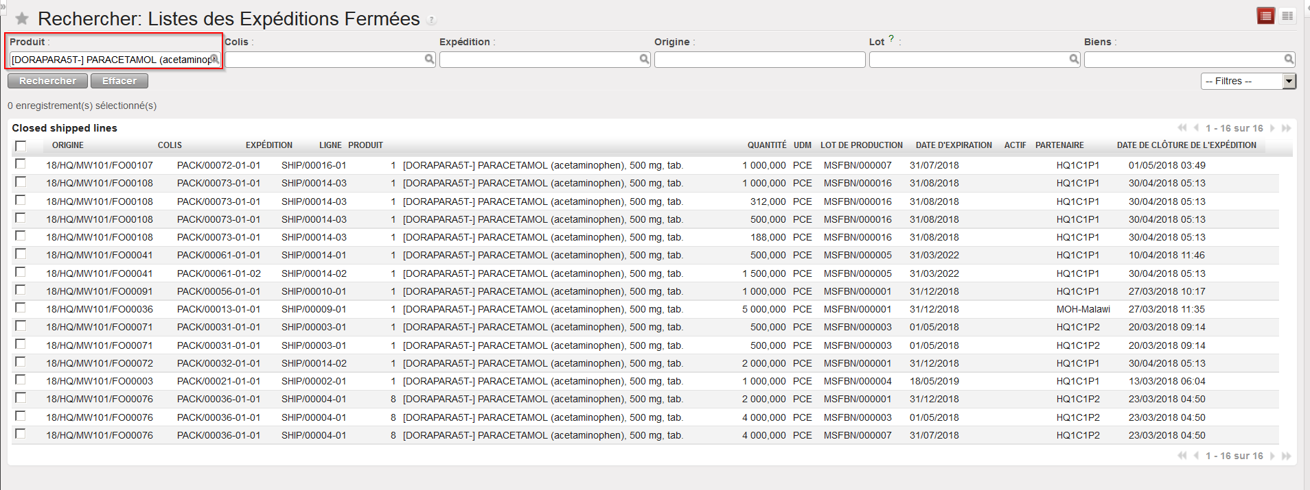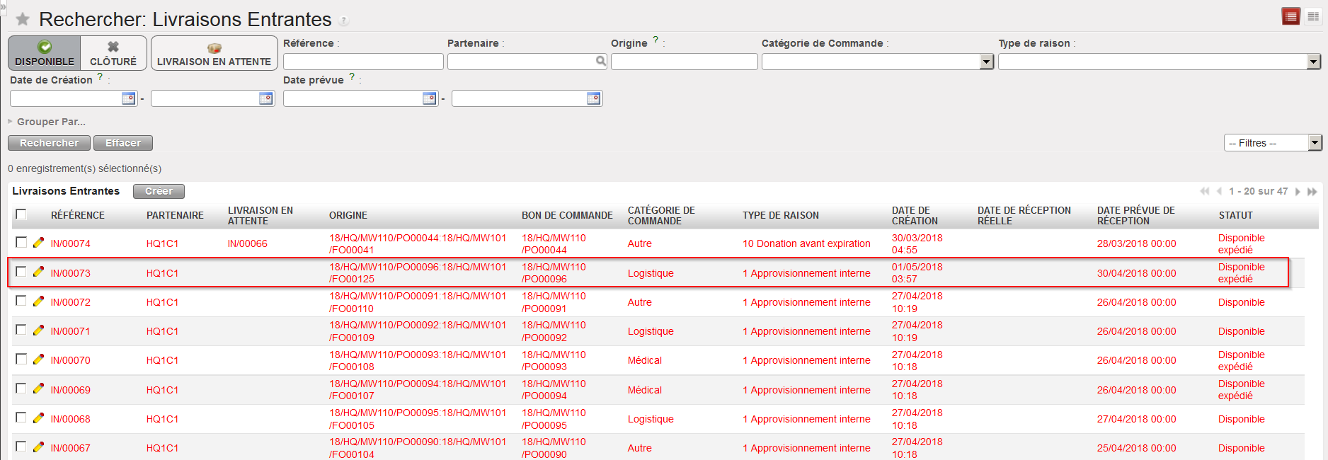Par défaut, le filtre “Disponible” est activé, et seuls les Bons de Livraison au statut “Disponible” sont affichés. Notez que dans l’exemple ci-dessous, une IR avec Zone de Demande = ECU est sourcée sur commande (PO). Ce PO est confirmé et le IN lié est partiellement réceptionné.