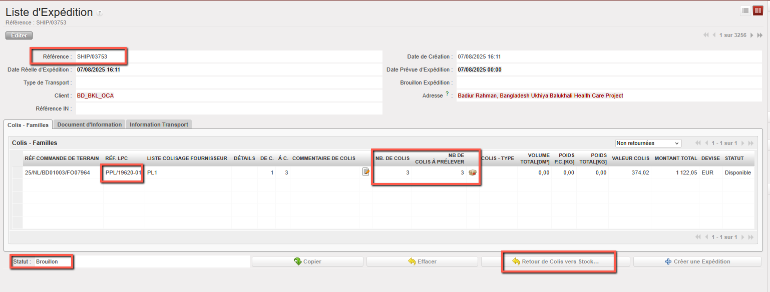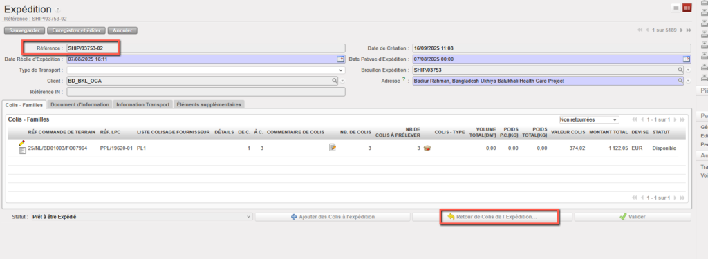 Si le bon de livraison a été créé à partir d’une demande interne (IR), le “Type de raison” sera “Unité de livraison“. Si le bon de livraison a été créé à partir une commande de terrain (FO), le “Type de raison” sera “Livraison partenaire“.