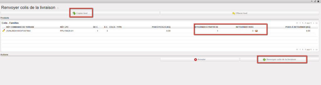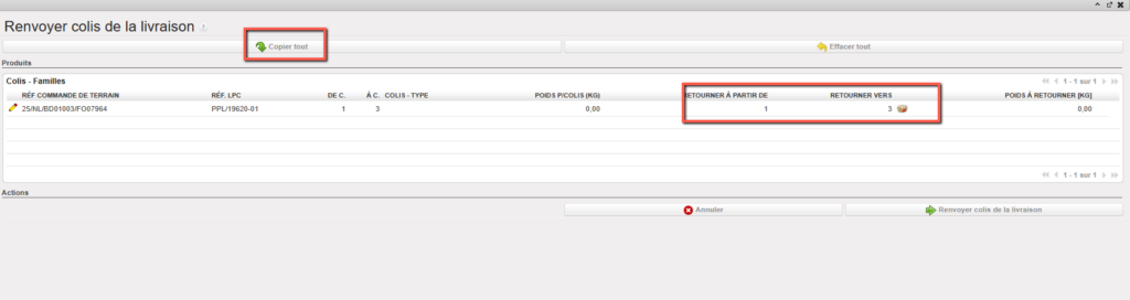 3. Sur l’écran “Produits à Traiter“, sélectionnez les produits et les quantités que vous souhaitez traiter en cliquant sur le bouton “Copier tout” ou en utilisant les icônes représentant un crayon. Si nécessaire, complétez la référence d’actif, le kit, le numéro de lot et/ou la date d’expiration en éditant les lignes et en cliquant sur l’icône représentant une disquette