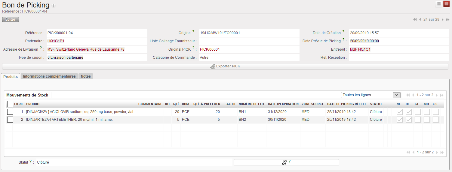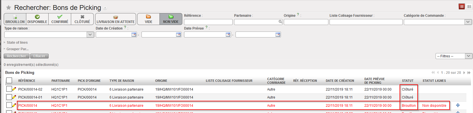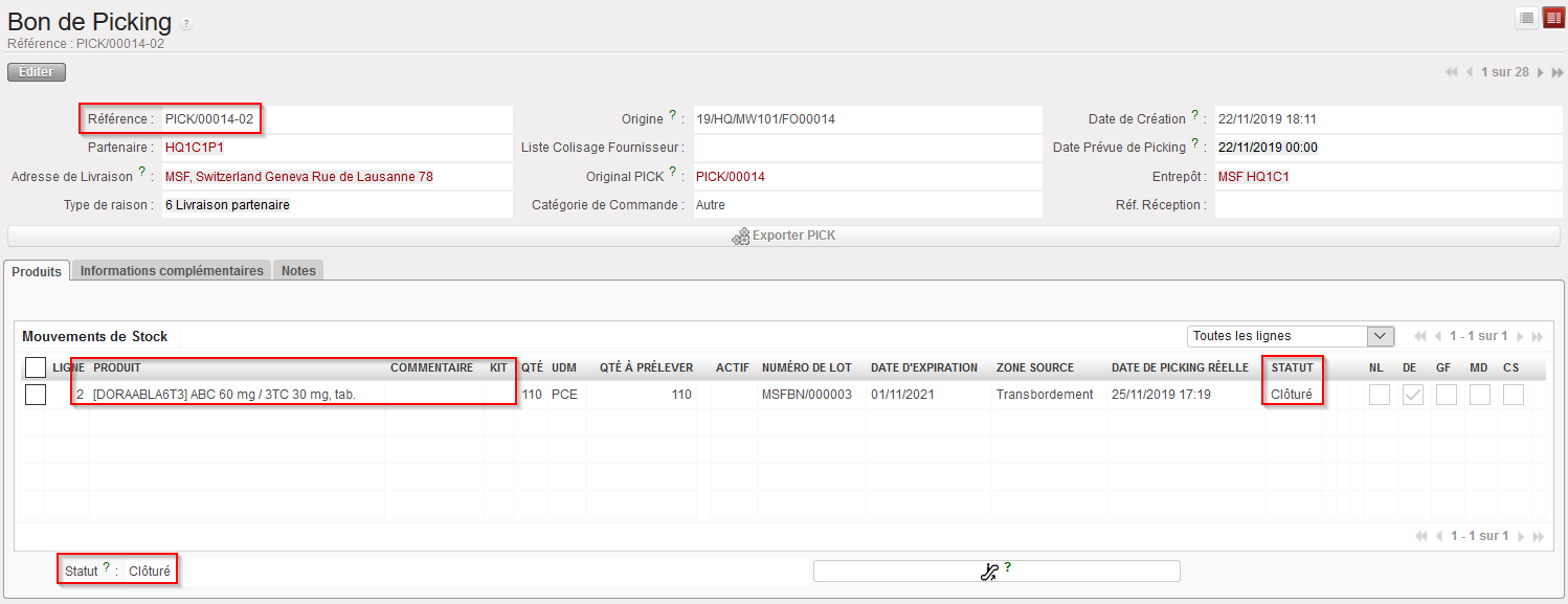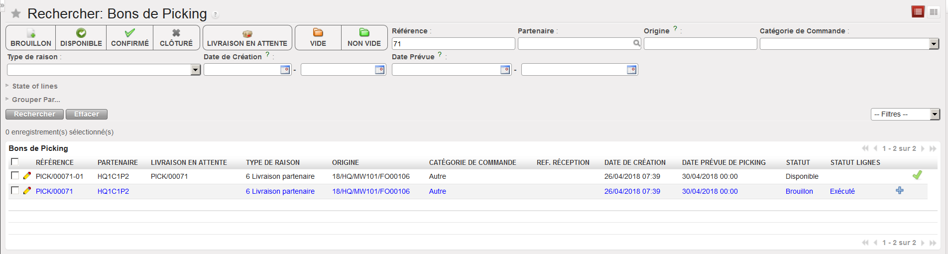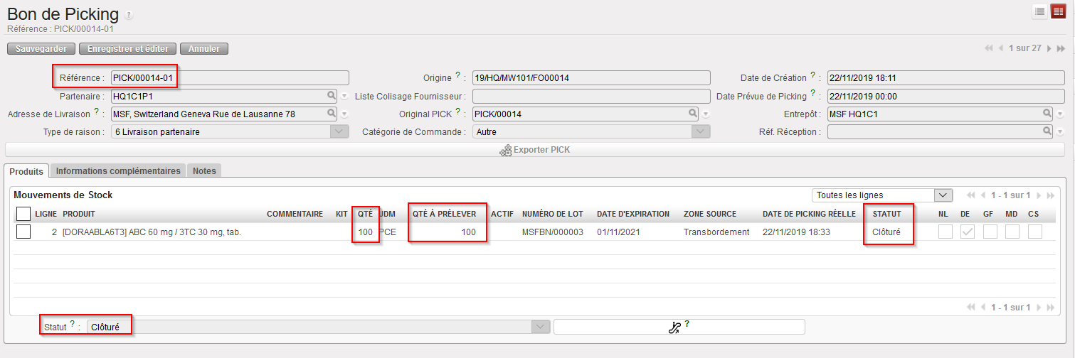 Le PICK principal conserve le statut “Brouillon” afin de permettre d’éventuels retours si nécessaire. Notez que le PICK principal est “Exécuté”.
