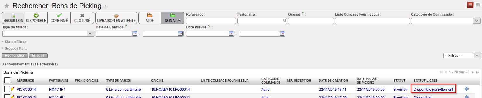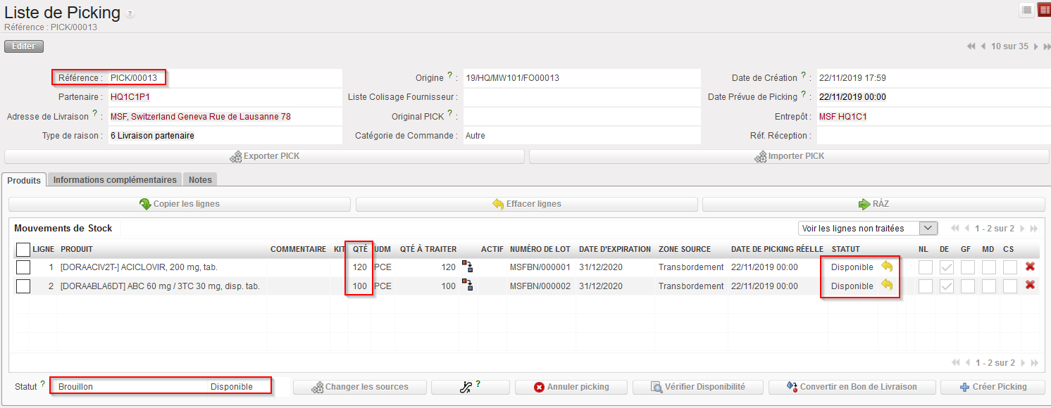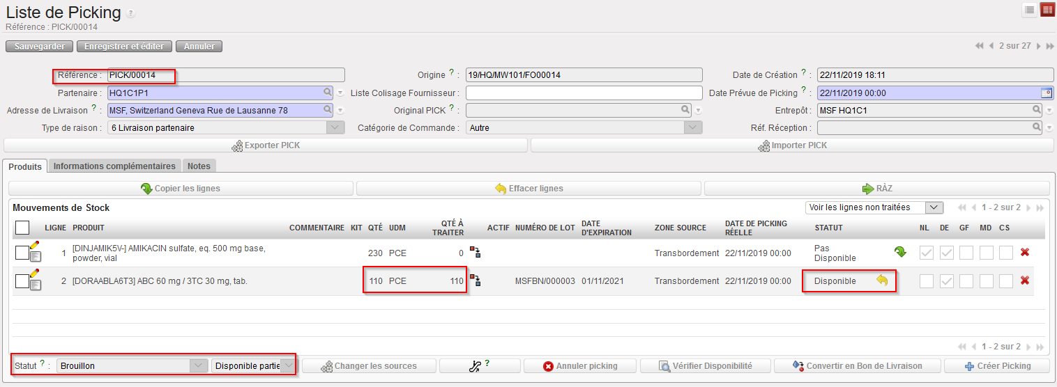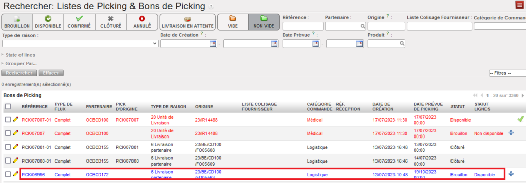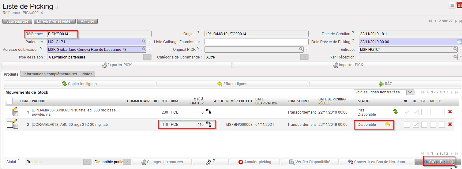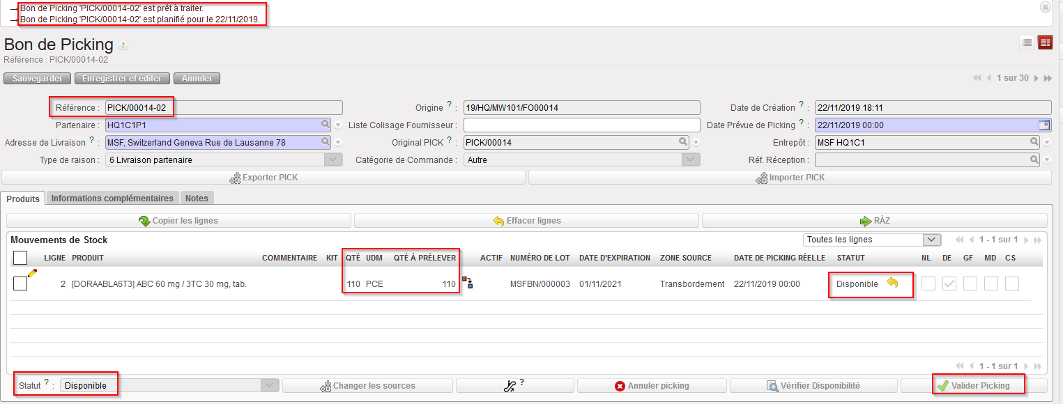 Le PICK principal conserve le statut “Brouillon” afin de permettre d’éventuels retours si nécessaire. Notez que le PICK principal est “Exécuté”.