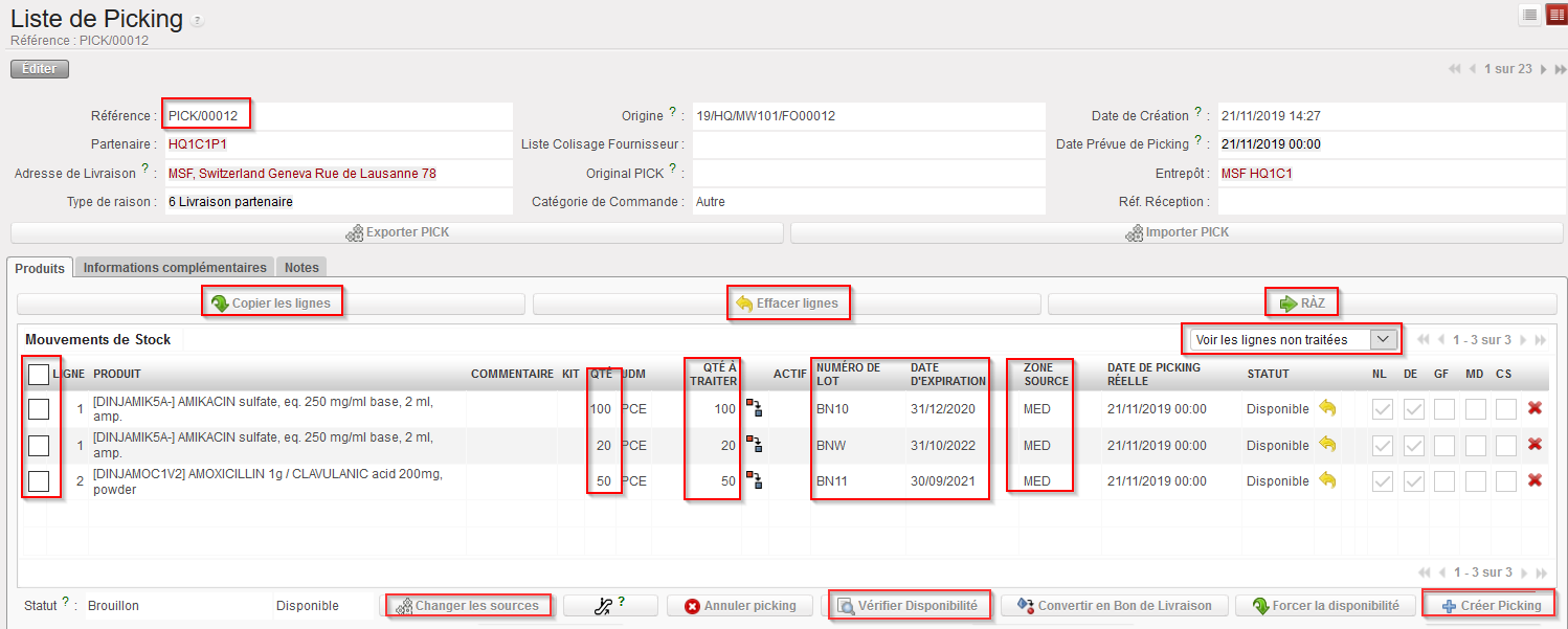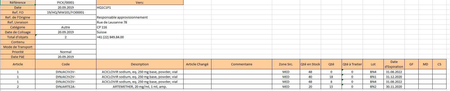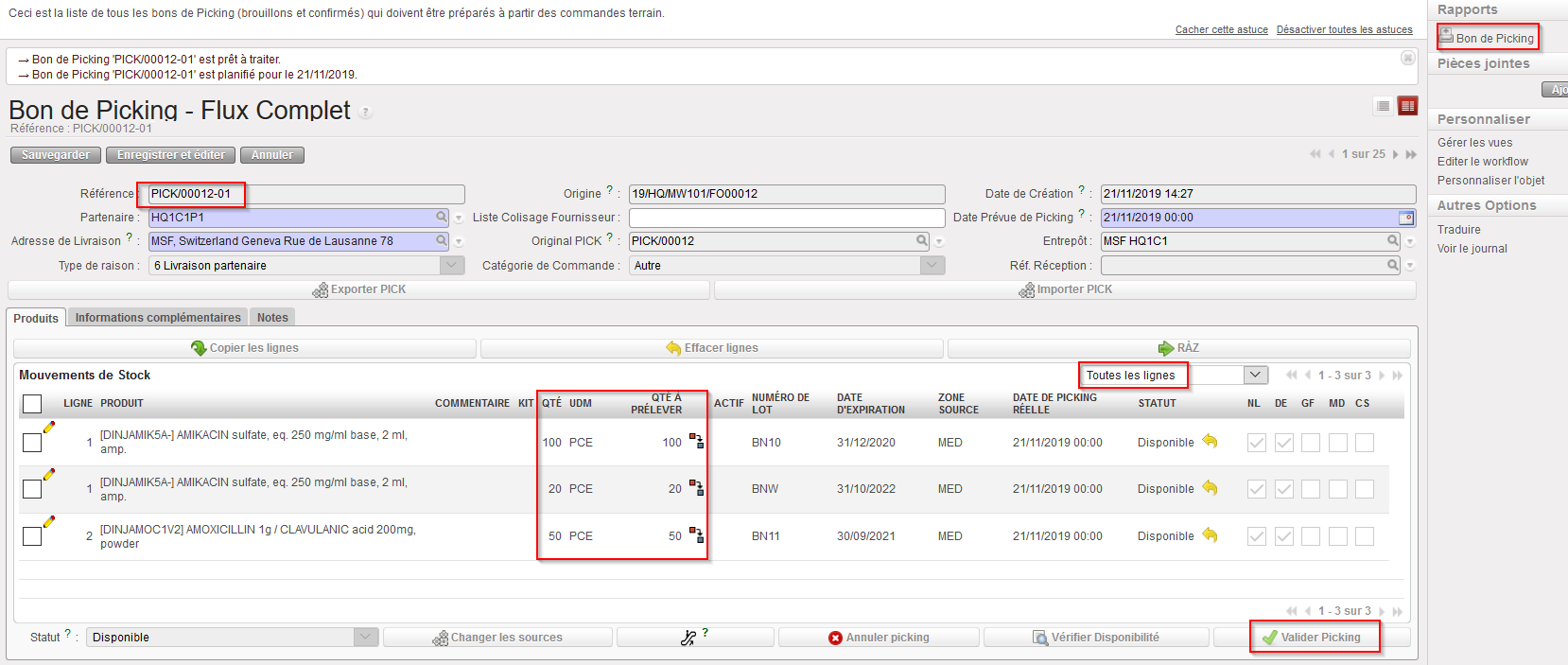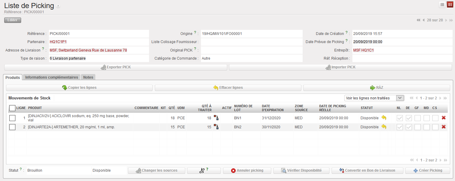 Un Bon de Picking principal (main PICK) est créé (ou mis à jour) suite à la confirmation d’une FO (ou ligne de FO). Il permet à l’équipe de l’entrepôt de visualiser dans le système quels sont les produits/quantités/lots qui devront être prélevées dans les jours ou semaines à venir. Les niveaux de stock virtuel sont mis à jour à cette étape.