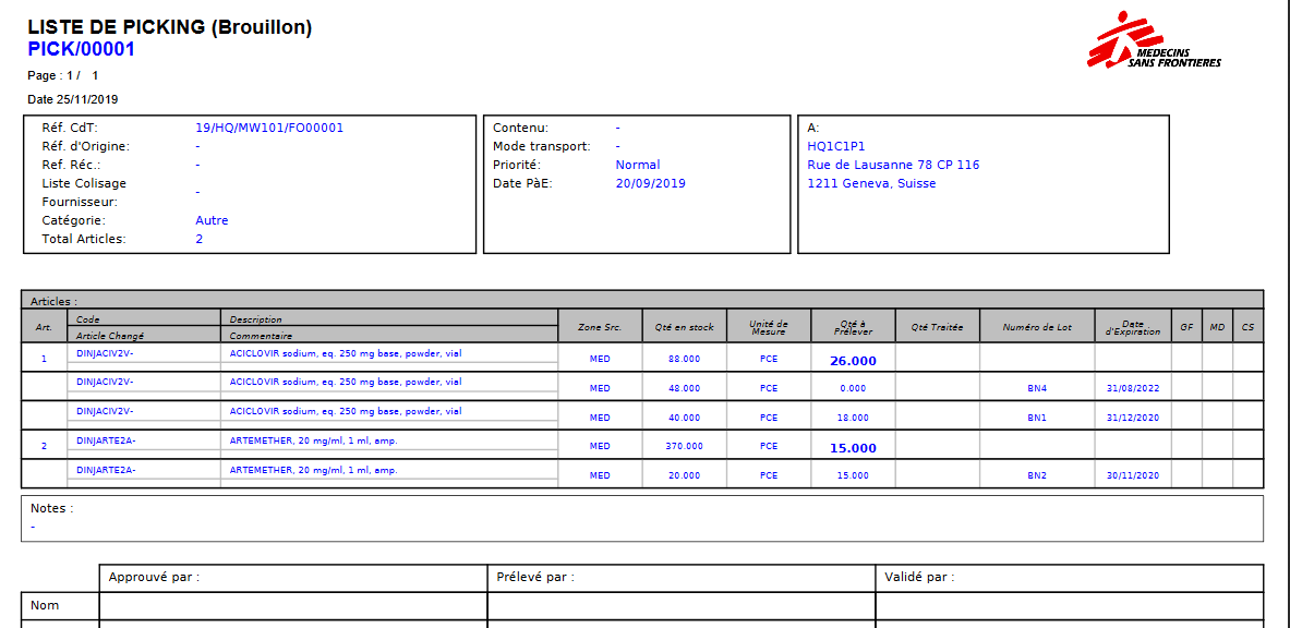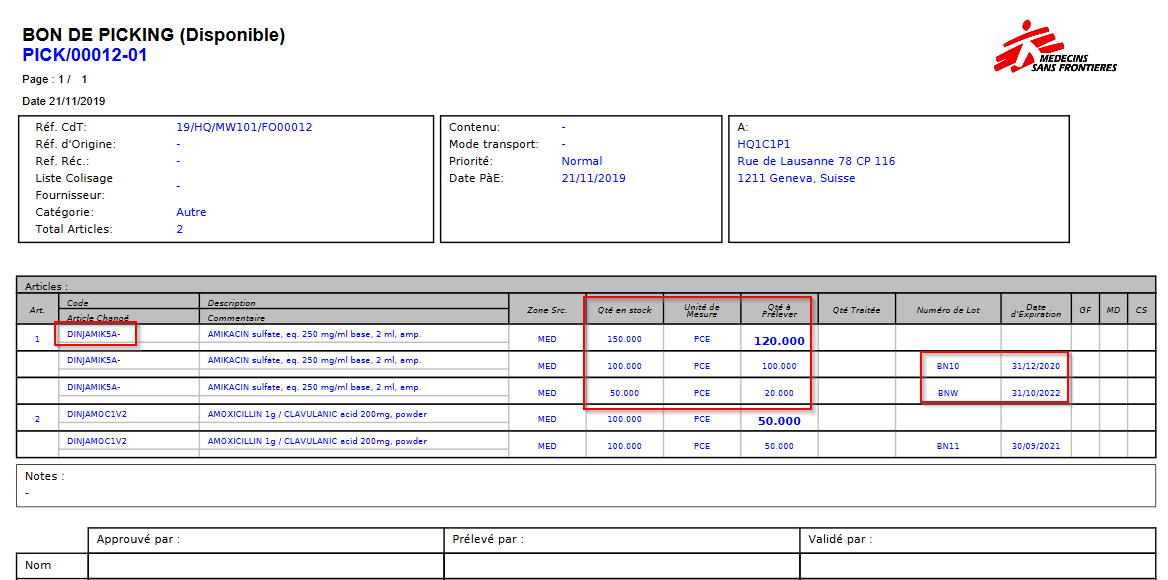 Le magasinier a besoin d’un document imprimé, listant produits et quantités (ainsi que des informations comme le BN ou l’ED) à prélever. Il utilise ce document afin de noter ce qui est effectivement prélevé et, le cas échéant, les changements nécessaires selon ce qui est physiquement disponible en stock.
