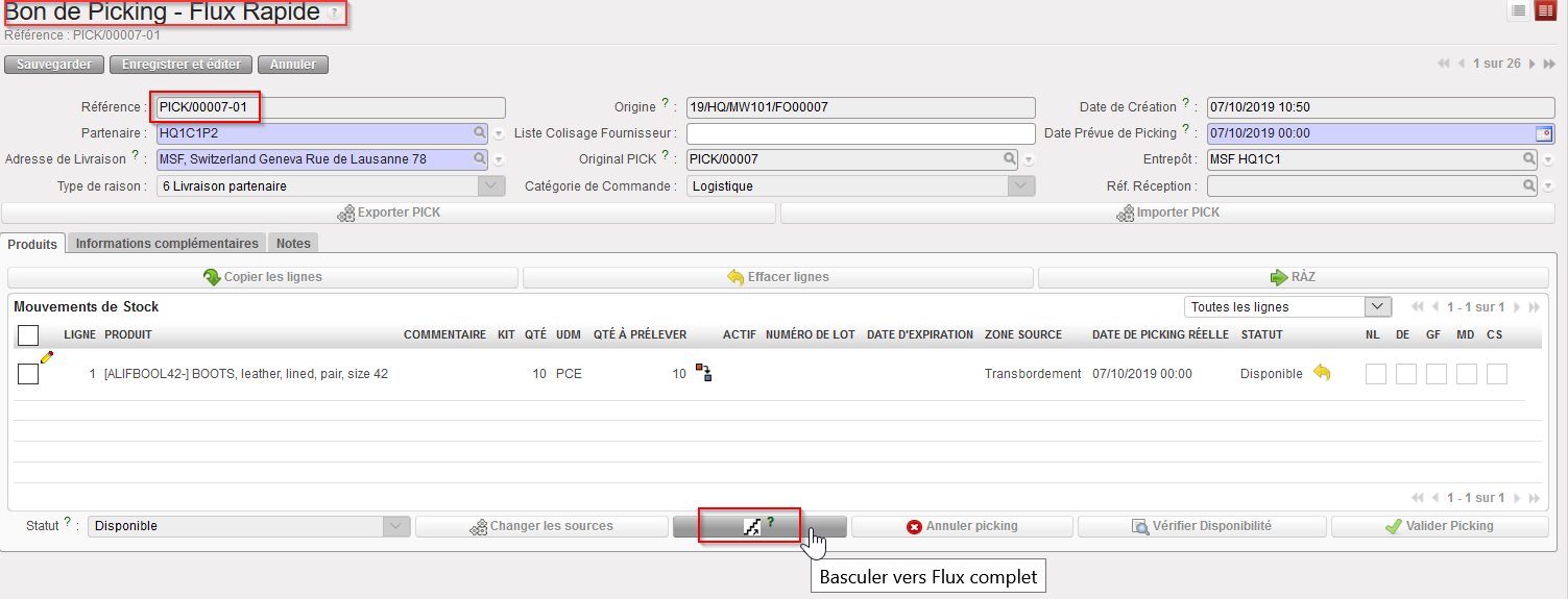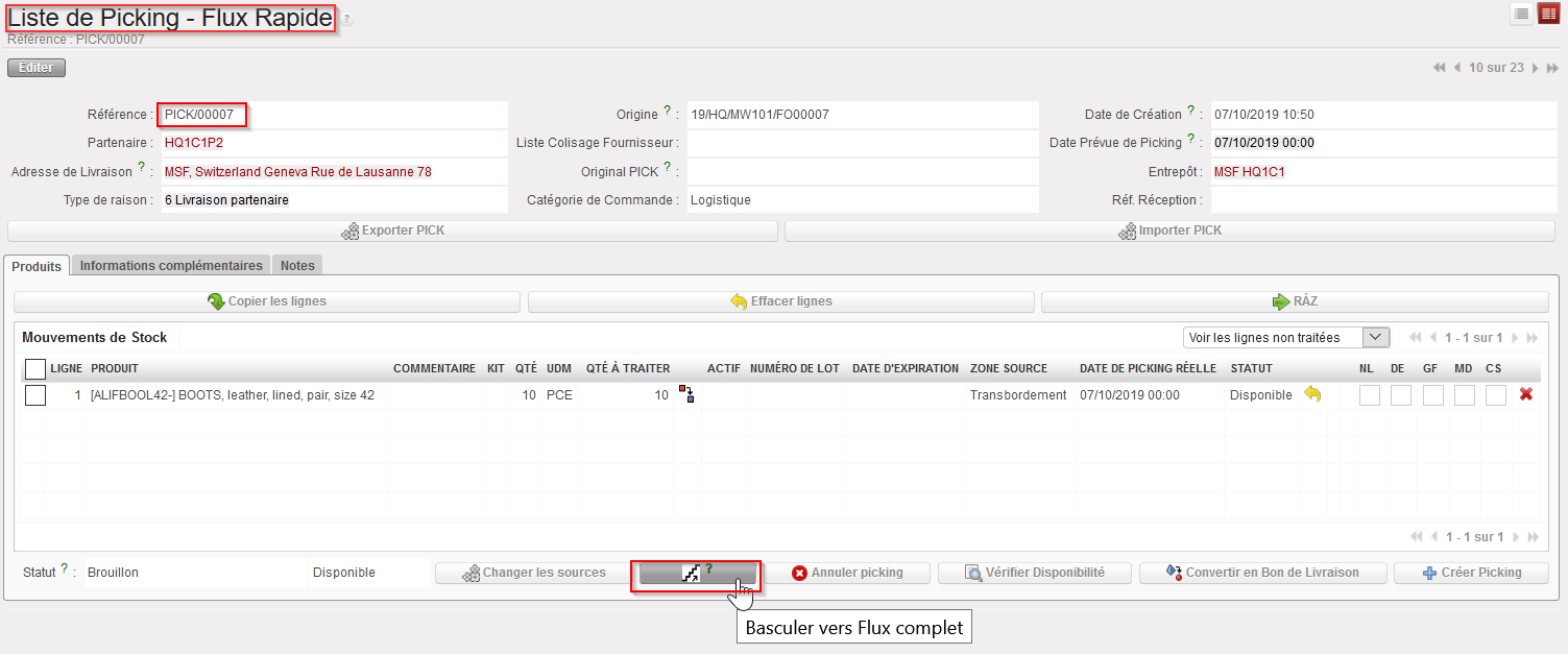La création d’un main PICK met à jour les niveaux de stock virtuel, en diminuant le niveau de stock virtuel de la zone source (depuis laquelle les marchandises seront prélevées) et en augmentant le stock virtuel de la zone “Colisage”. La validation du sub PICK met à jour les stocks réels de ces deux zones.