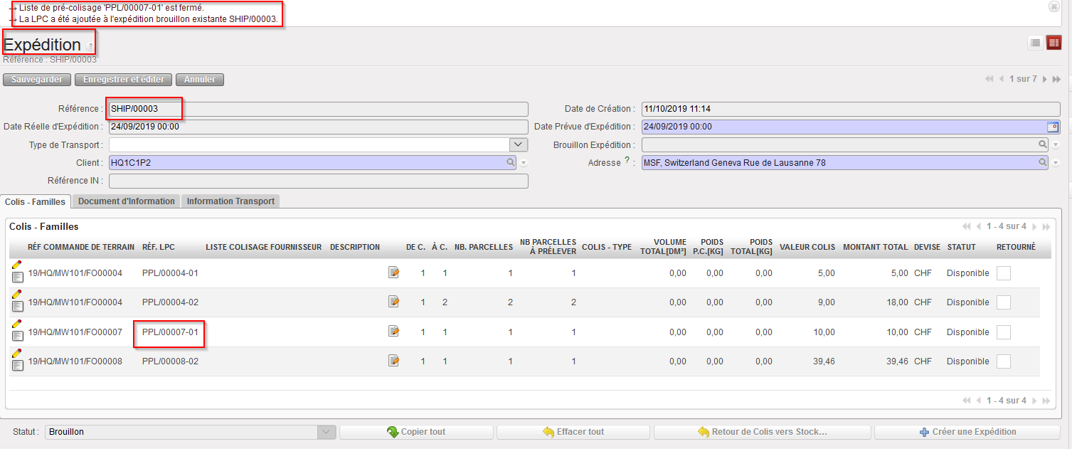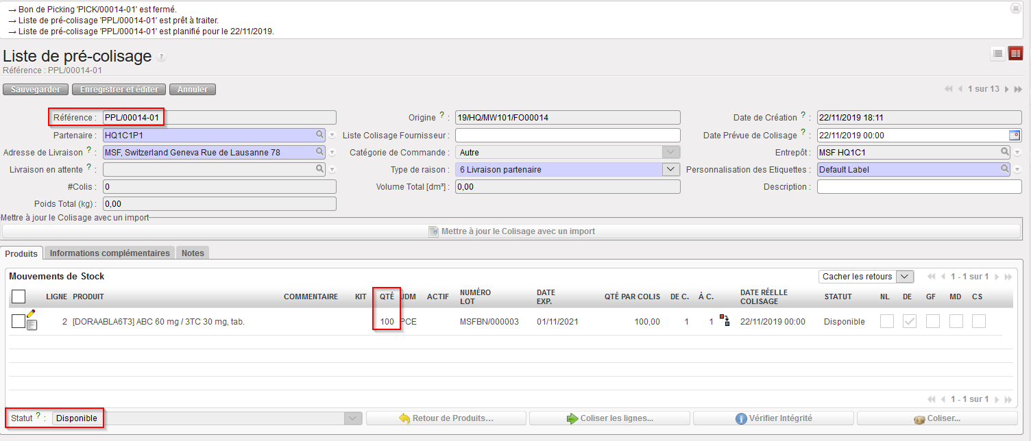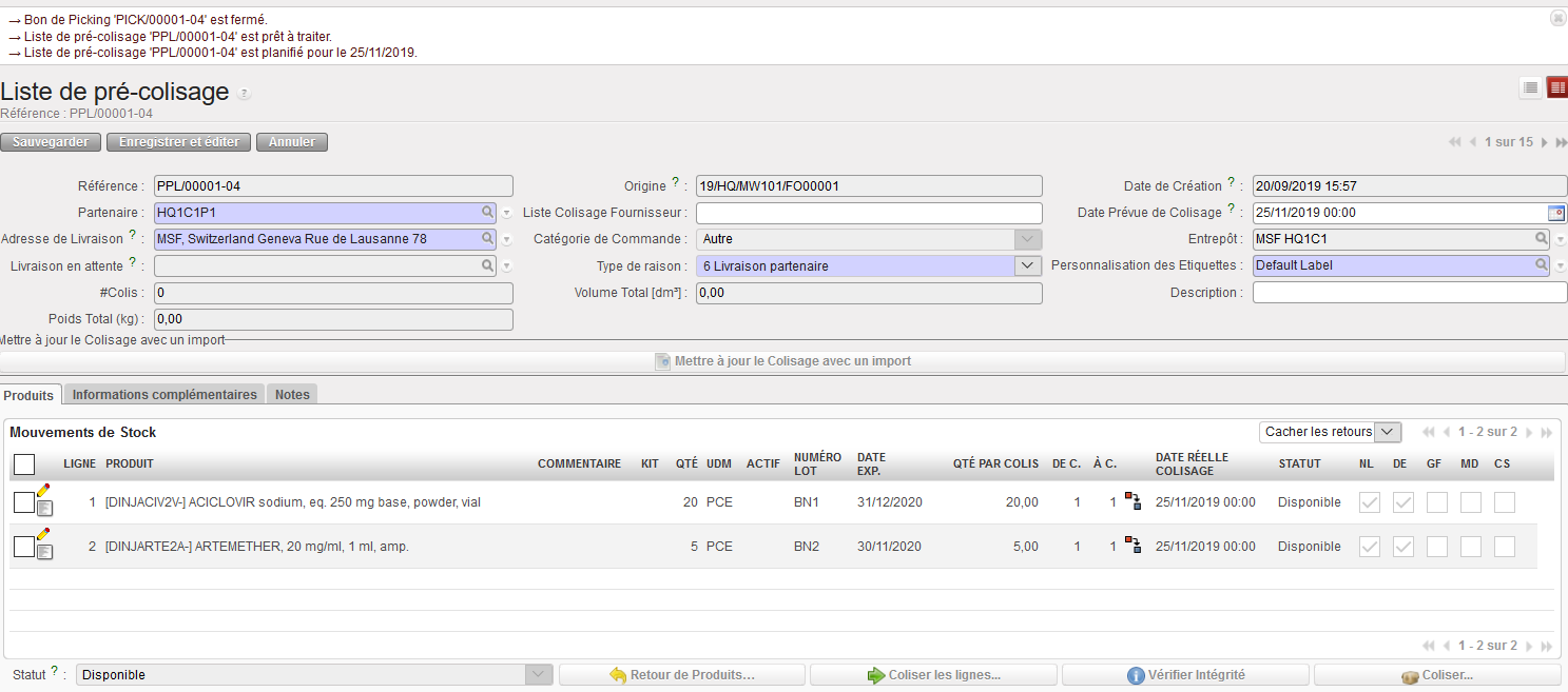 Une fois le picking réalisé dans le magasin, le sub PICK est validé (et possiblement mis à jour) avec les quantités et lots qui ont été prélevées physiquement. Les produits/quantités/lots prélevés sont transférés vers une Liste de Pré-Colisage (Pre-Packing List ou PPL). Les niveaux de stock réel sont mis à jour à cette étape.
