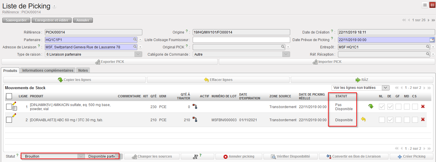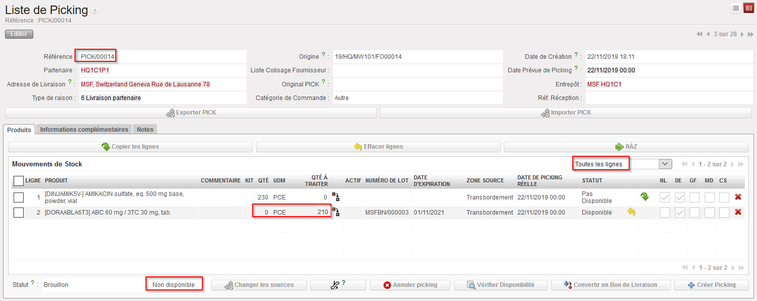 Dans l’exemple ci-dessus, le main PICK est créé suite à la confirmation d’un PO. Ce main PICK est “Partiellement disponible”. Une de ses lignes est “Disponible” car les produits ont déjà été réceptionnés en cross docking. L’autre n’est “Pas disponible” car les produits n’ont pas encore été réceptionnés.