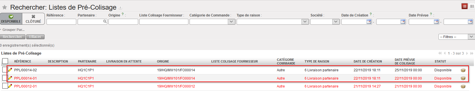 La Liste de Pré-Colisage (Pre-Packing List/PPL) correspondante est créée (si le sous-PICK validé a la référence PICK/000XY-AB, la PPL correspondante aura la référence PPL/000XY-AB).