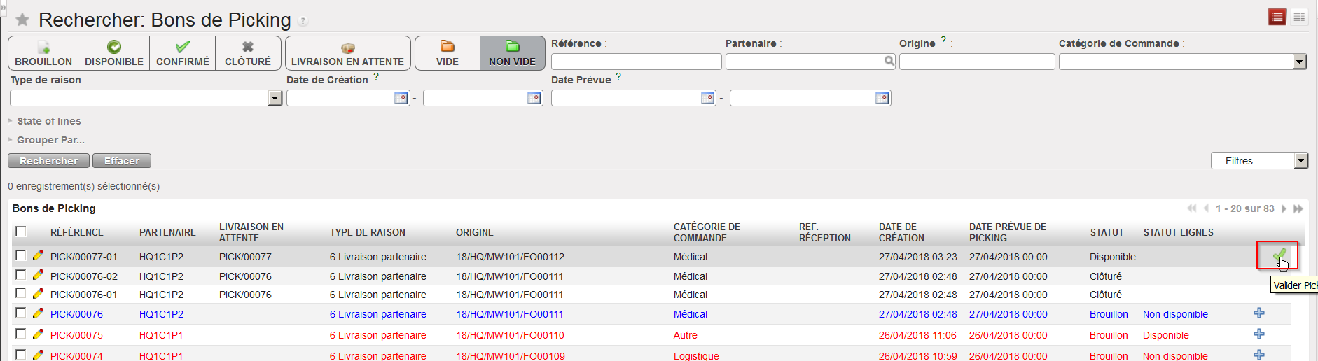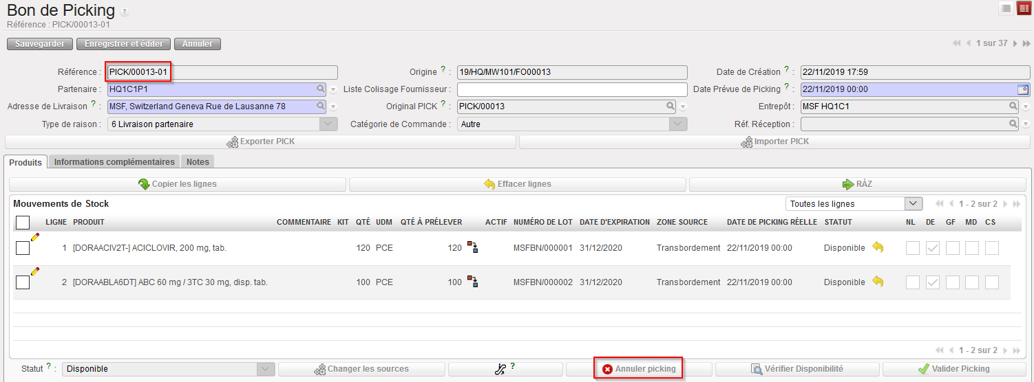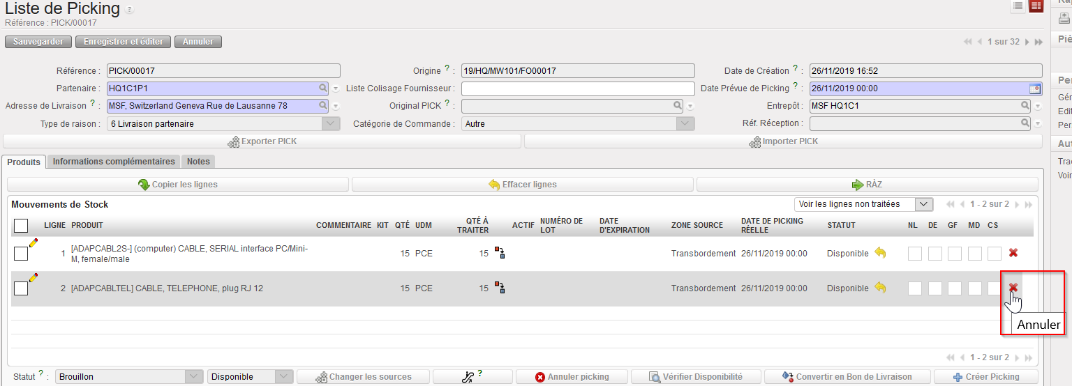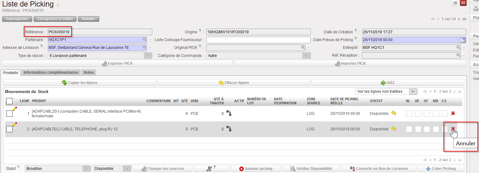 Ouvrez le Bon de Picking que vous souhaitez annuler (sous-PICK dans ce cas).