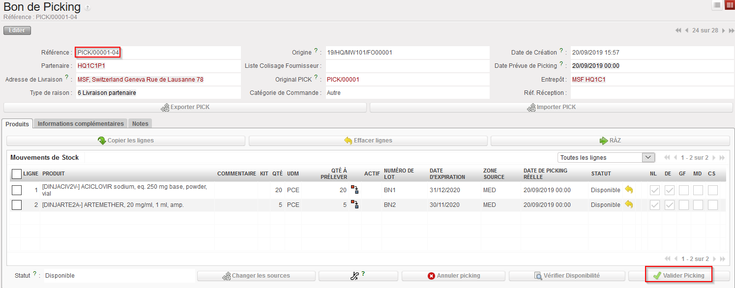 13. Cliquez sur le bouton “Valider Picking” (avec la flèche verte) pour enregistrer les quantités/lots prélevés.