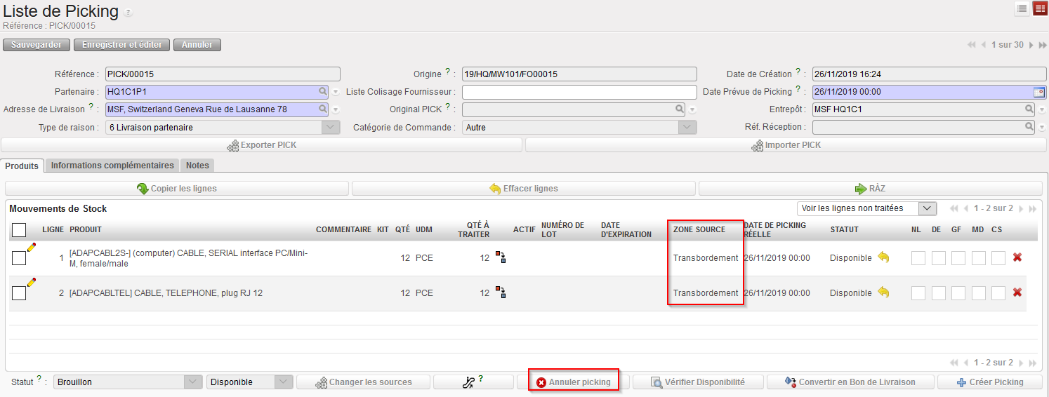2) Annuler & ressourcer un Bon de Picking au niveau ligne