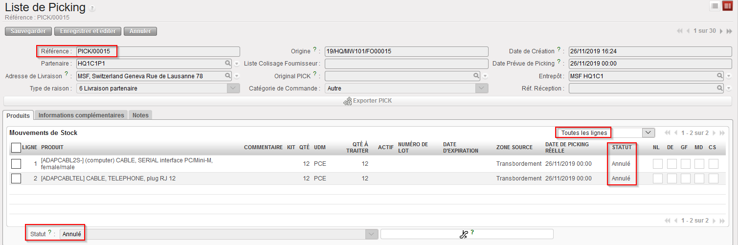 Le main PICK (ainsi que toutes ses lignes) passe au statut “Annulé”.