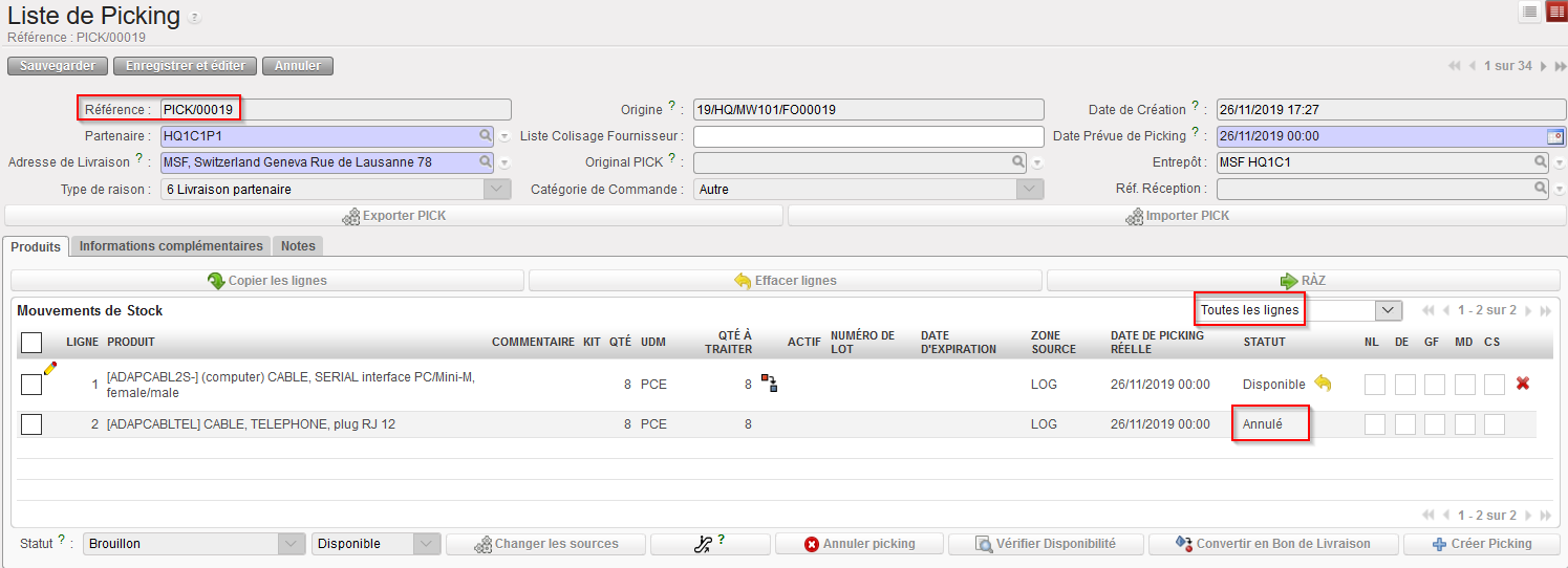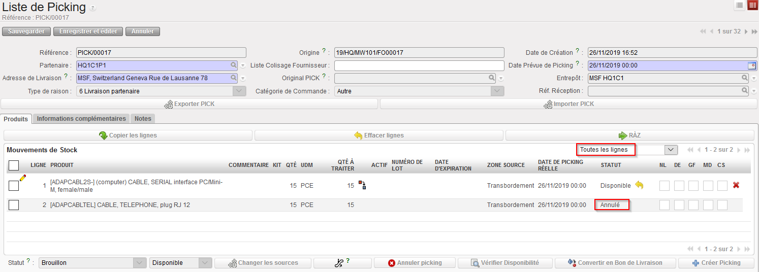 Le statut du Bon de Picking (et celui de toutes ses lignes) passe à “Annulé”.