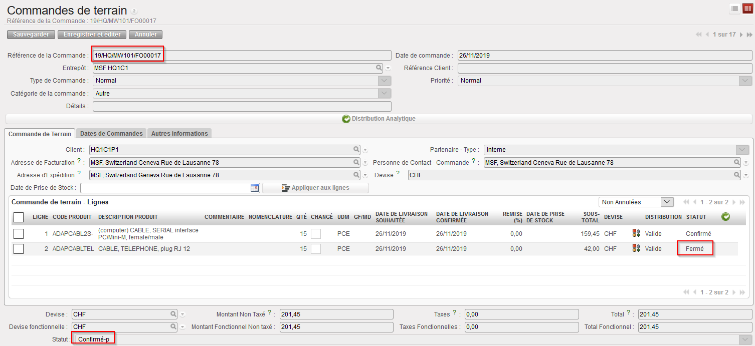 Notez que cela déclenche aussi la fermeture de la FO liée tandis que les lignes de FO sont au statut “Clôturé” (voir ci-dessous).