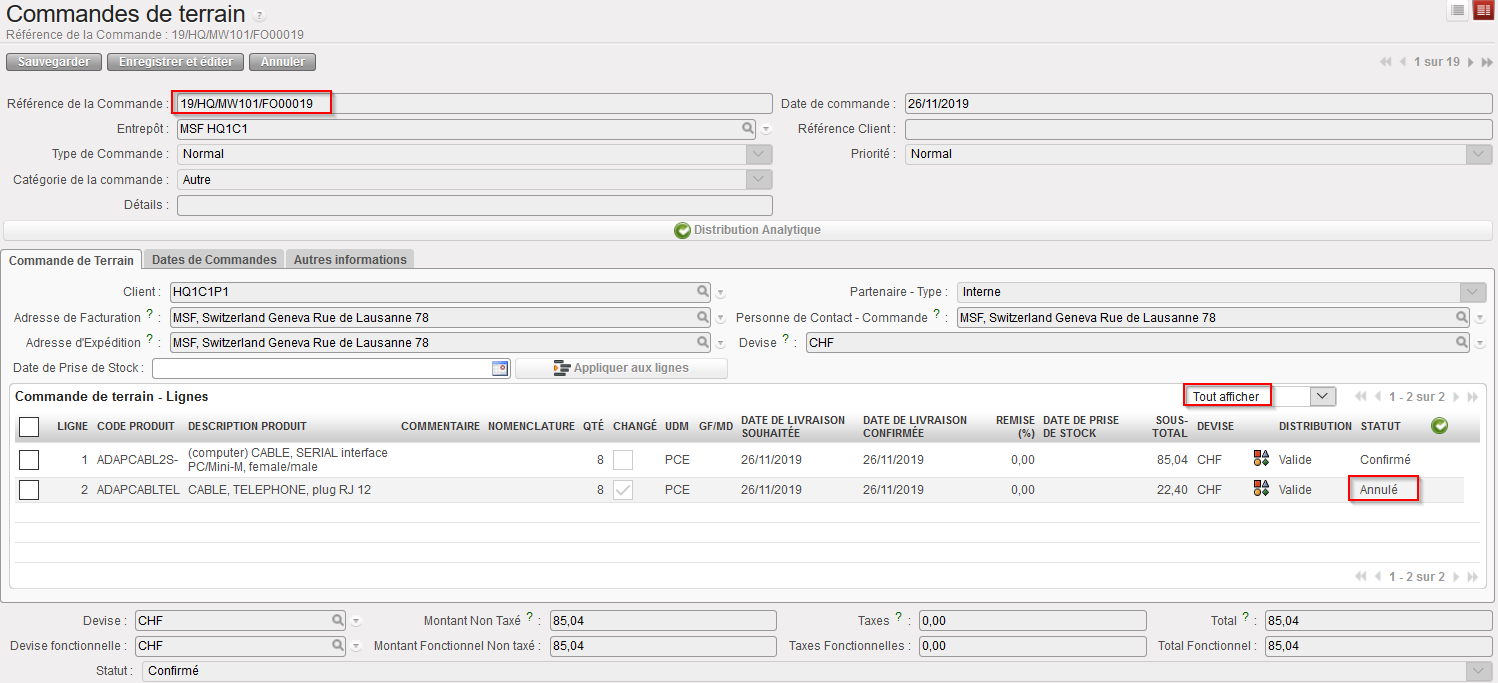 Par conséquent, le statut de la FO correspondante (et celui de toutes ses lignes) passe à “Annulé” (voir ci-dessous). Notez qu’il faut utiliser le filtre « Tout afficher » pour voir les lignes Annulées.