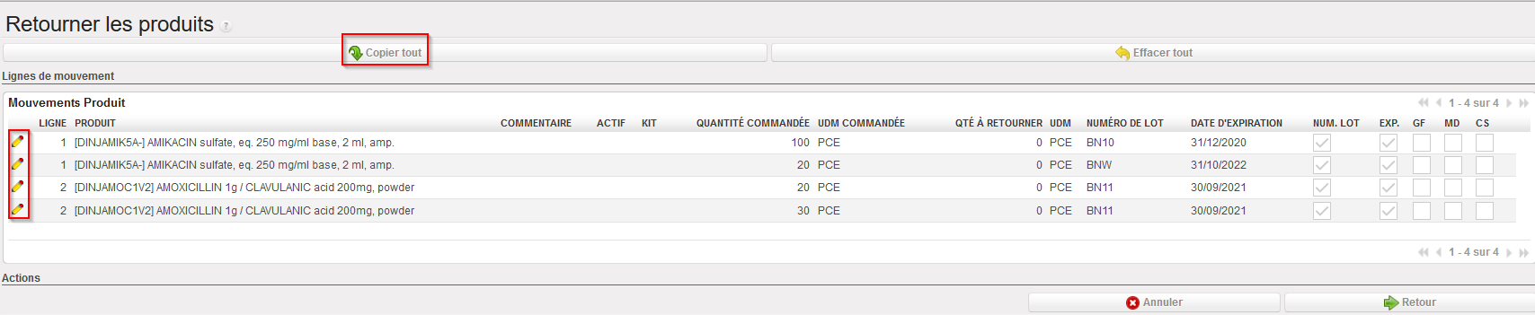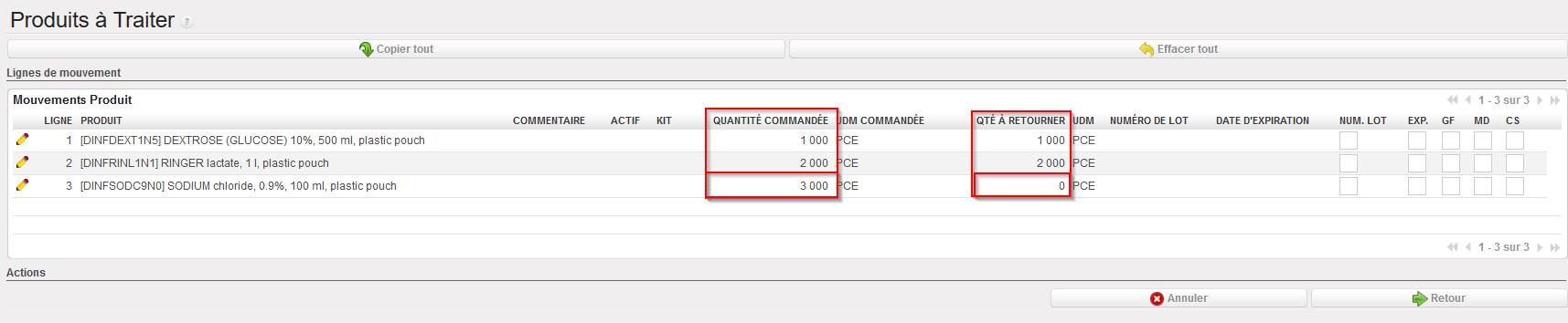 - Si vous recevez exactement ce qui est sur le IN “Disponible” (i.e. pas de back-order), cliquez sur le bouton “Copier tout” situé en haut de l’écran pour réceptionner tous les articles en intégralité.