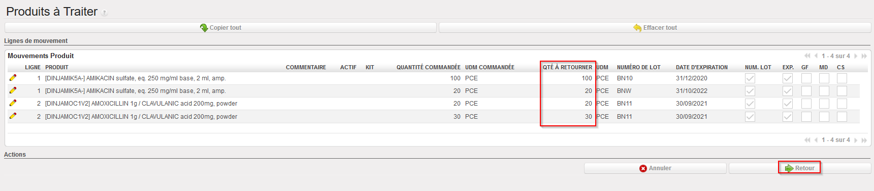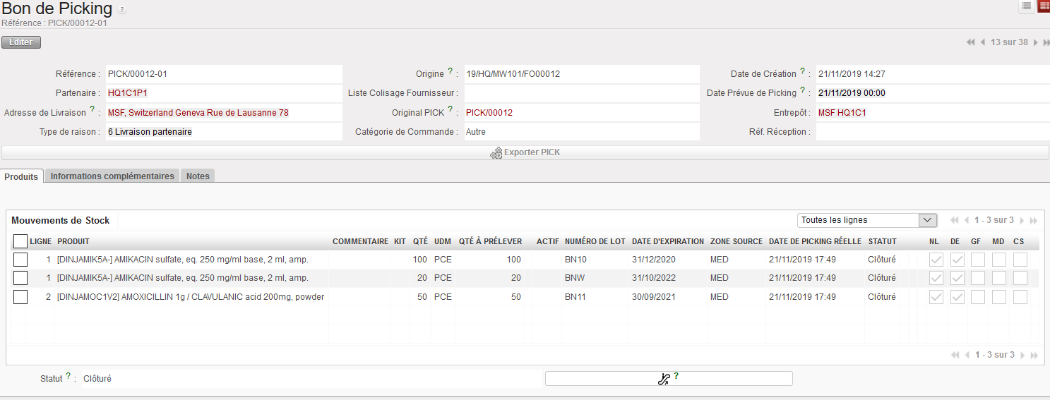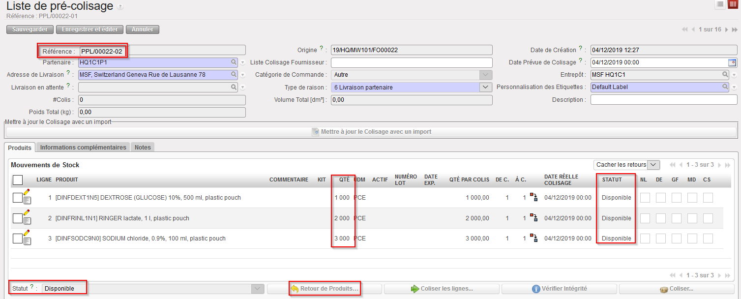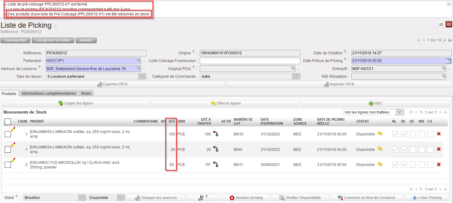 Nous verrons également que si des produits gérés par lot (BN) et/ou par date d’expiration (ED) sont réceptionnés, l’utilisateur devra encoder numéros de lot et dates d’expiration à cette étape (i.e. lors du traitement du IN).