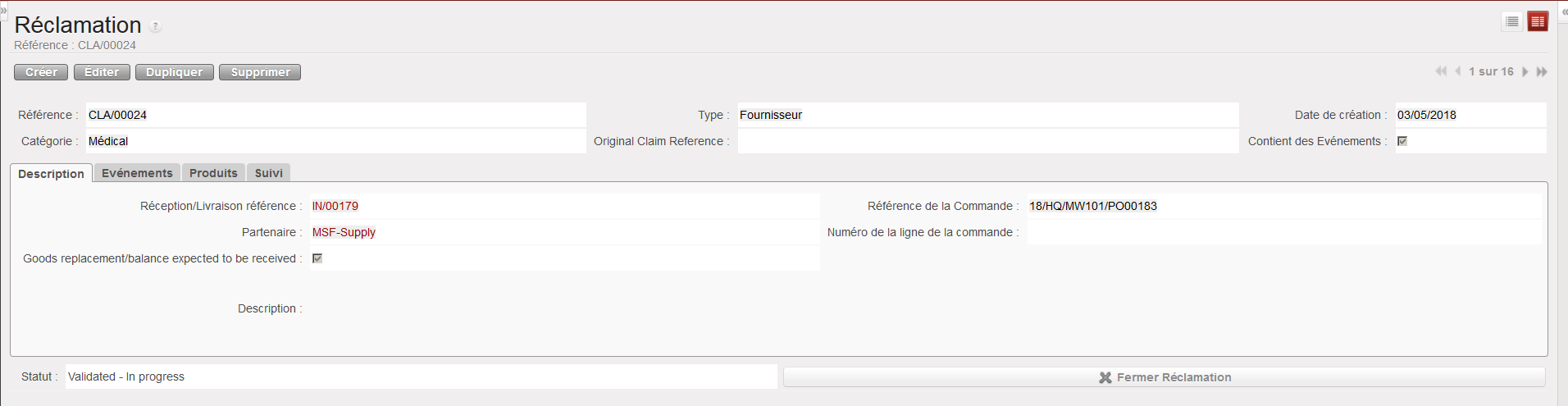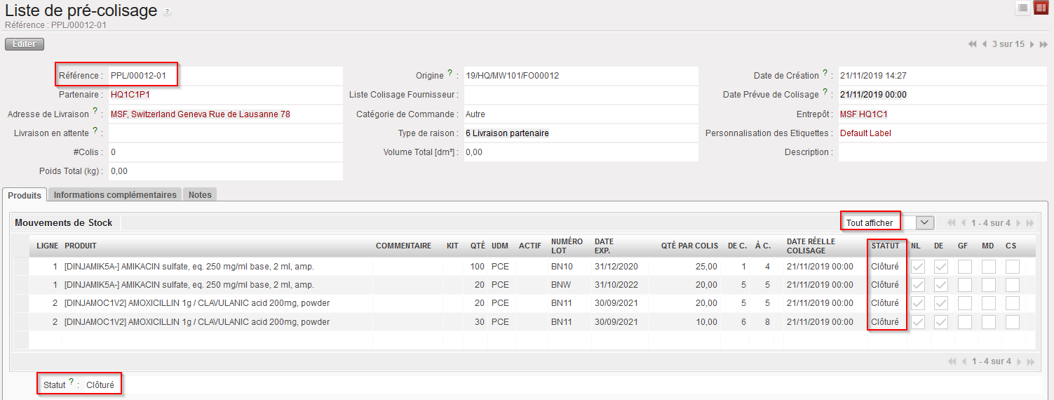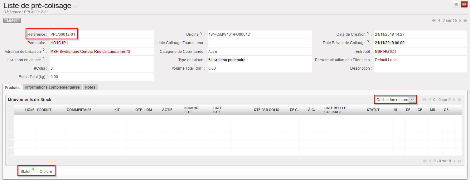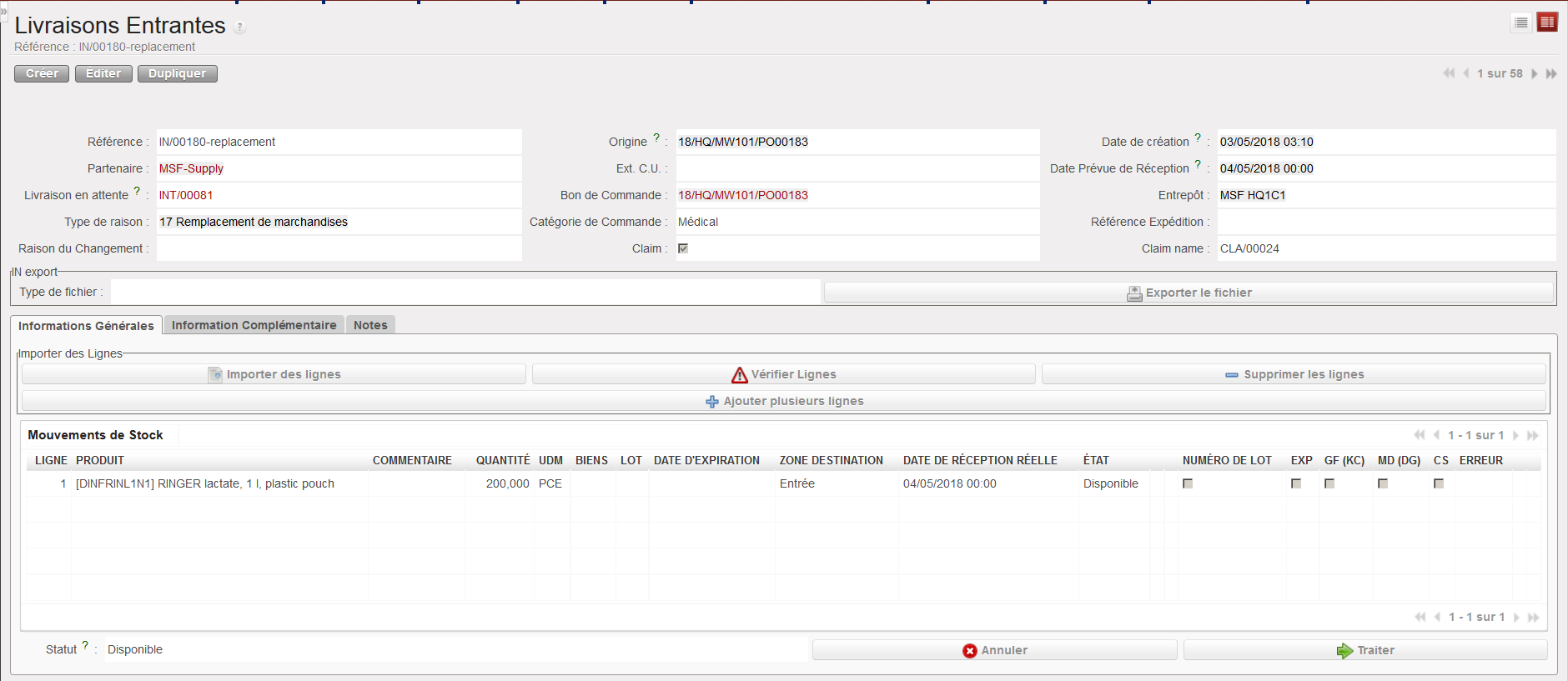 Comme nous le verrons plus tard, si une Livraison Entrante n’est que partiellement traitée (i.e. partiellement réceptionnée, avec certains articles restant en back-order), un nouveau IN sera créé au statut “Clôturé” pour enregistrer les produits reçus tandis que le IN initial sera mis à jour et restera ouvert (“Disponible”) afin de pouvoir réceptionner les articles resté en back-order dans le futur.