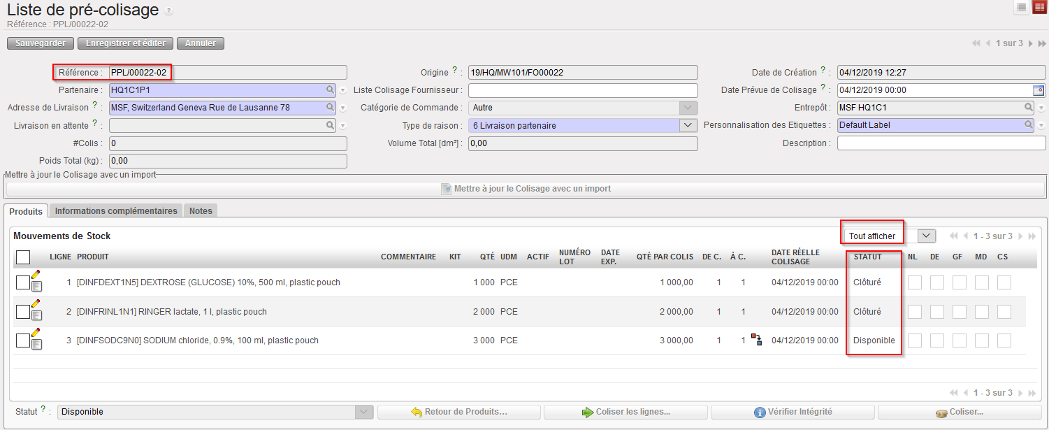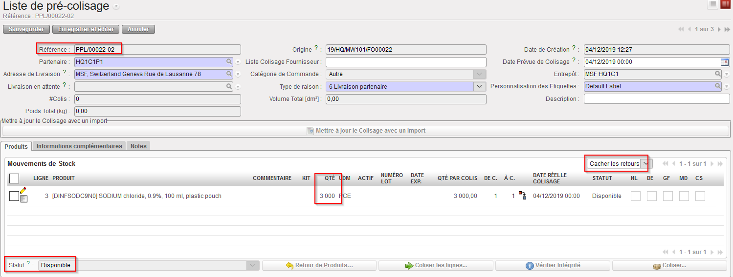 Notez que si un IN est créé suite à la confirmation partielle d’un PO, ce IN (au statut “Disponible”) reprendra les lignes qui ont été confirmées sur le PO. Si, par la suite, d’autres lignes sont confirmées sur le PO, elles seront ajoutées sur le IN “Disponible”. Tant que ce IN n’a pas été complétement réceptionné, il restera ouvert (au statut “Disponible”) et les confirmations supplémentaires sur le PO correspondant seront ajoutées sur ce IN. Une fois le IN complètement réceptionné, son statut passera à « Clôturé » et une confirmation supplémentaire sur le PO générera la création d’un nouveau IN (au statut “Disponible”).