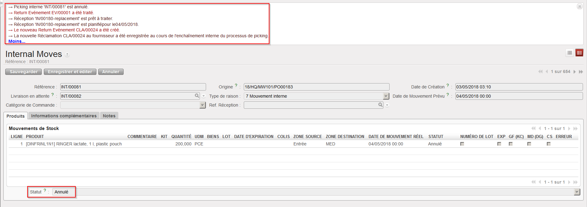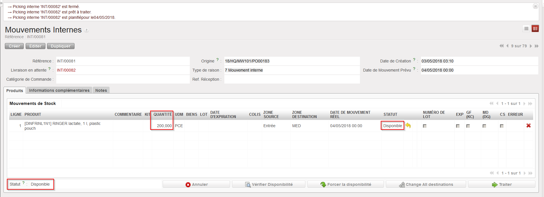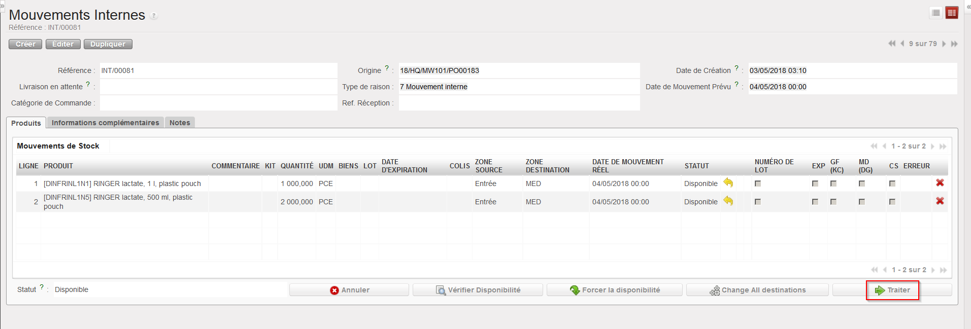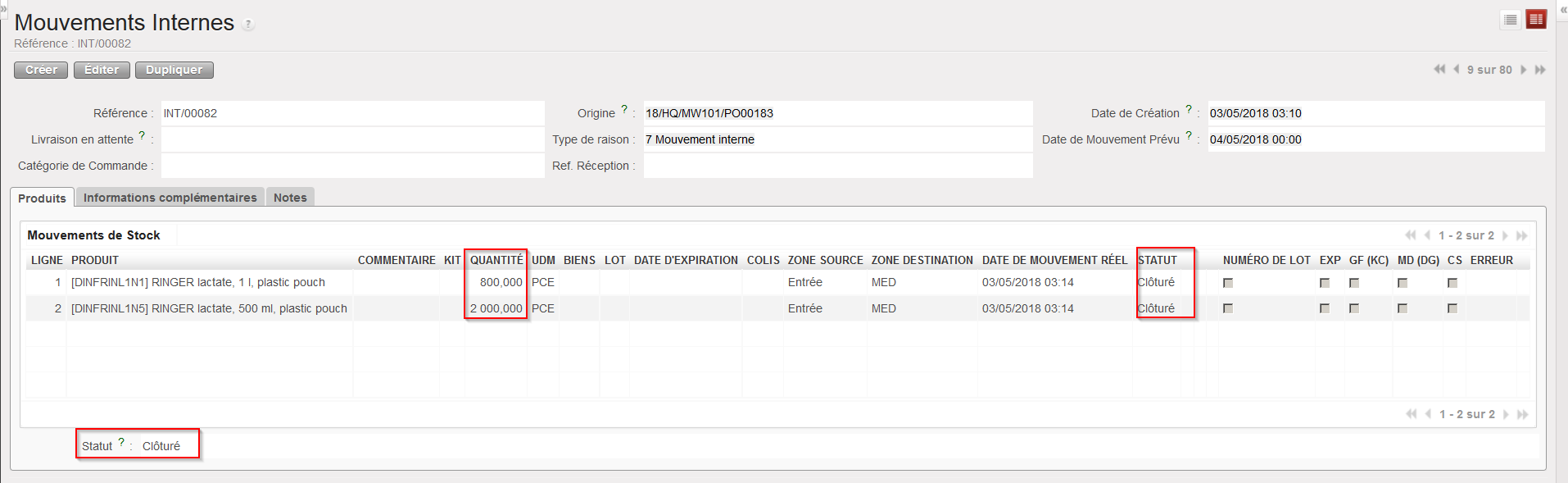 Si la case “Directement en zone requérante” est restée cochée, les produits sont maintenant arrivés à leur destination finale. Un mouvement Interne depuis la zone de réception (“Entrée”) et vers la zone destination a été automatiquement créé, traité et clôturé.