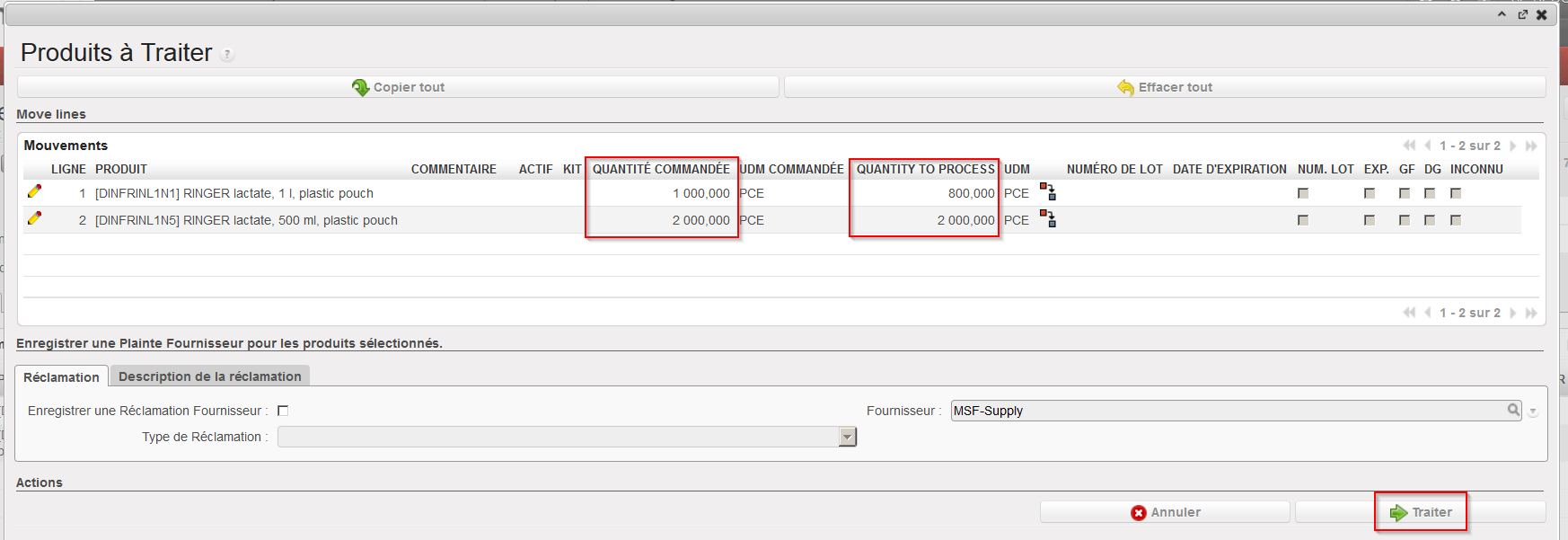 4. Cliquez sur le bouton “Traiter” situé au bas de l’écran pour enregistrer la réception.