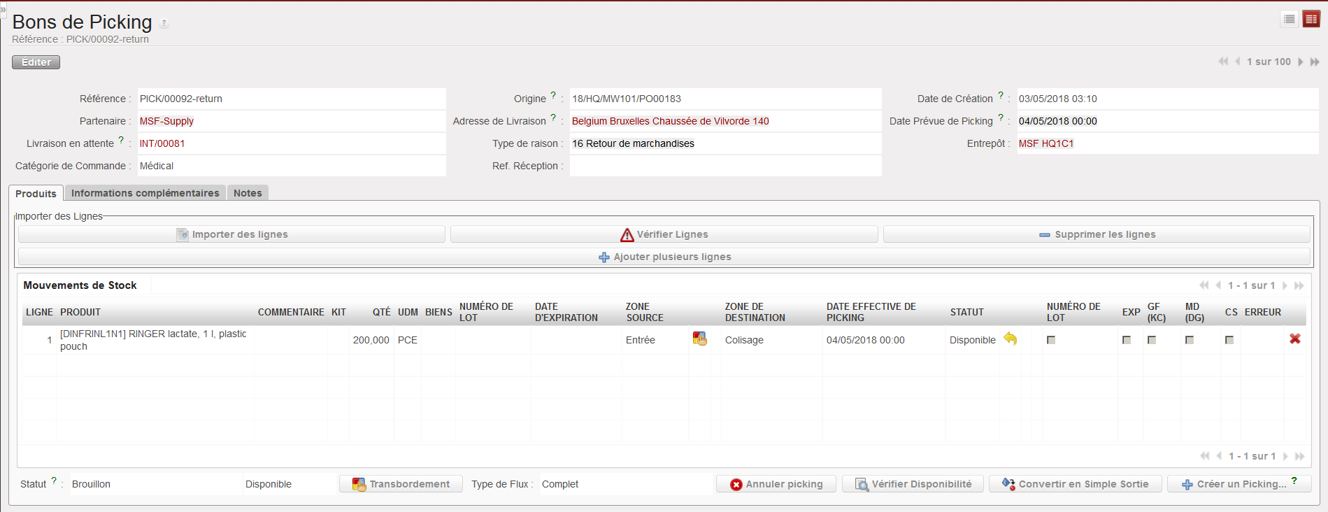 Si votre IN est liée à un PO adressé à un fournisseur interne (une autre instance), un statut supplémentaire sera utilisé: “Disponible expédié”. Une Livraison Entrante dont le partenaire est une autre instance ne doit pas être traité au statut “Disponible” mais uniquement au statut “Disponible expédié”.