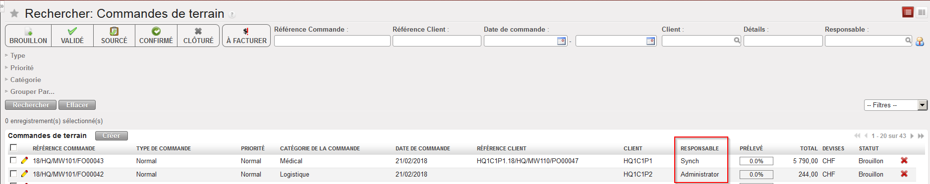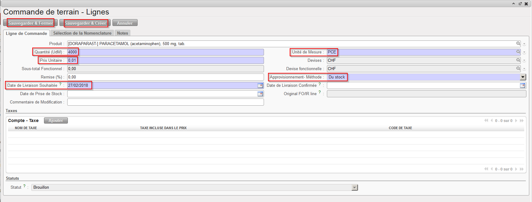 9. Cliquez sur le bouton “Sauvegarder” en haut de l’écran principal de la FO pour sauver votre commande, le statut initial de celle-ci sera “Brouillon”.