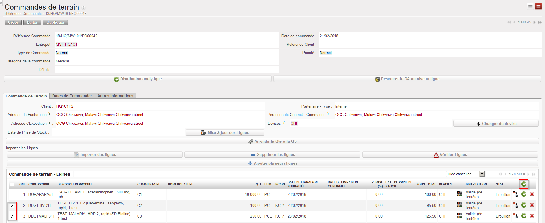 6. Insérer des lignes de commande manuellement en cliquant sur le bouton “Créer” sur l’onglet “Commande de Terrain” (table “Commande de terrain – Lignes”) pour ajouter des lignes une par une ou sur le bouton “Ajouter plusieurs lignes” pour ajouter plusieurs lignes en une étape.